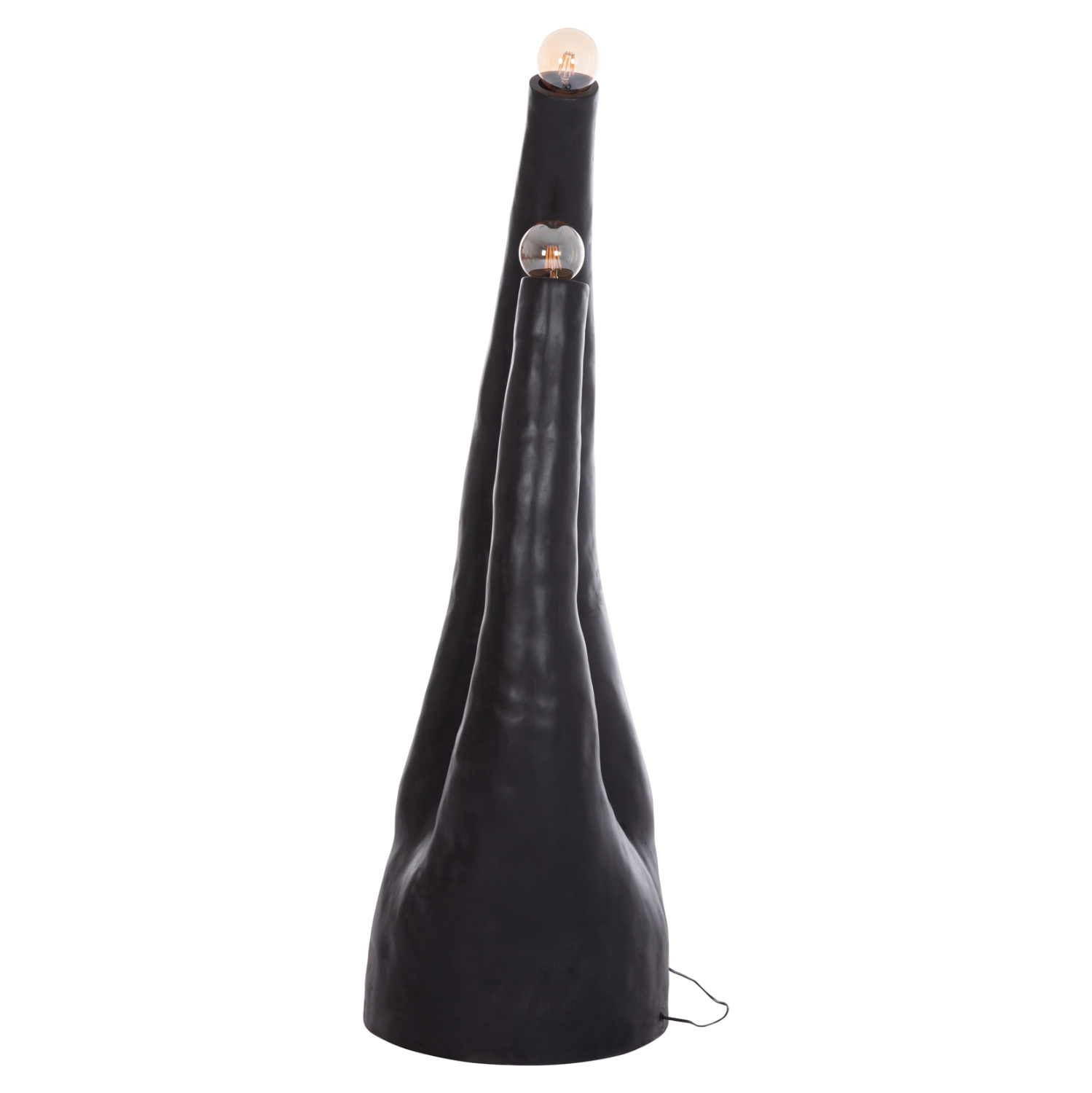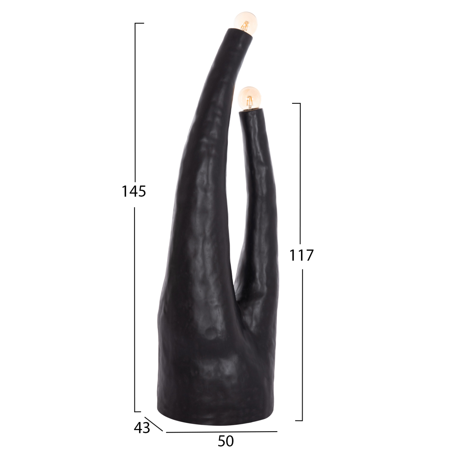 Το χειροποίητο και επιβλητικό διακοσμητικό φωτιστικό δαπέδου TUSKEN έχει ακανόνιστο αλλά μοντέρνο design με δύο λάμπες σε διαφορετικά ύψη. Διαθέτει μεγάλο καλώδιο τροφοδοσίας με διακόπτη on/off. Είναι κατασκευασμένο εξολοκλήρου από Fiber Cement σε ΜΑΥΡΟ χρώμα και αποτελεί ιδανικό συμπλήρωμα τόσο για το σπίτι, όσο και για επαγγελματικούς χώρους, όπως ξενοδοχεία, AirBnB, κτλ.