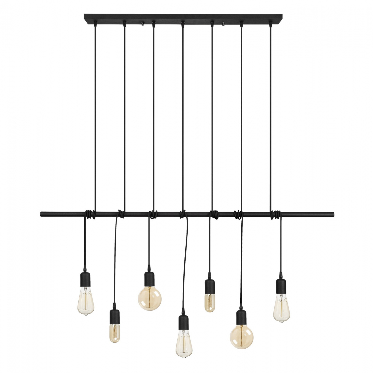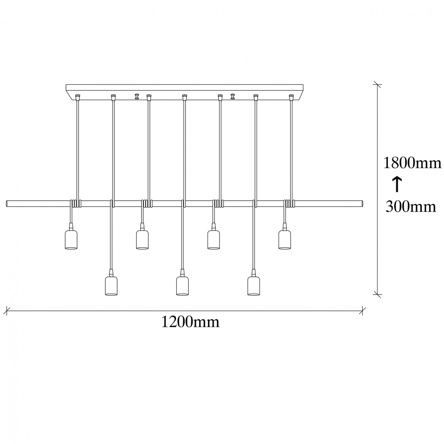 που σας επιτρέπει να ρυθμίσετε το ύψος που σας ικανοποιεί, σε μαύρη απόχρωση και 7 αναρτήσεις που καταλήγουν στους λαμπτήρες, επίσης μαύρου χρώματος.