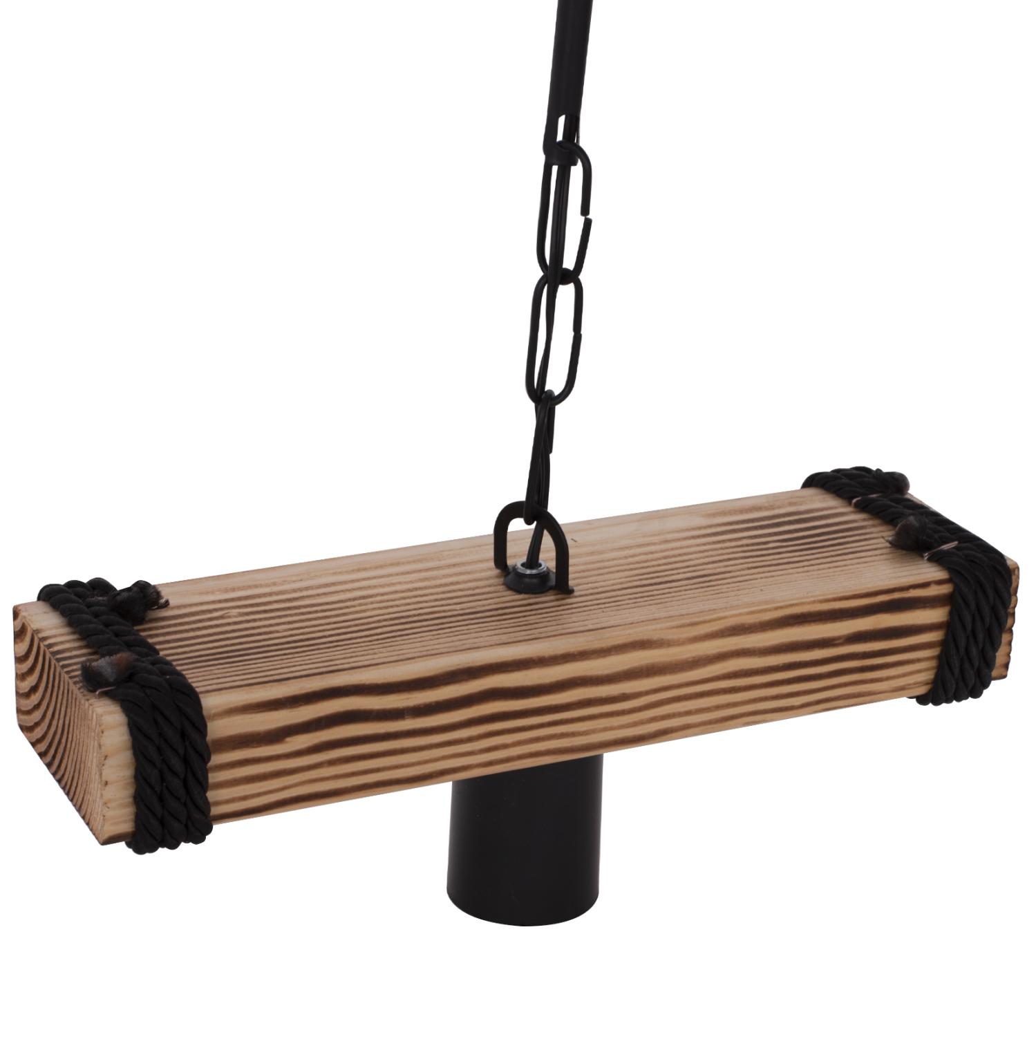 Πρόκειται για ένα όμορφο φωτιστικό με ξεχωριστή αισθητική και απλή εμφάνιση. Το φυσικό χρώμα του ξύλου με την μαύρη μεταλλική αλυσίδα και το μαύρο ντουί της λάμπας συνδυάζονται υπέροχα και αιχμαλωτίζουν τα βλέμματα, αλλά ταυτόχρονα απαιτούν και ιδιαίτερη διακοσμητική συνοχή για να αναδείξουν πλήρως τις αισθητικές αρετές του φωτιστικού. Η μη ύπαρξη «καπέλου» επιτρέπει στο φως να διαχέεται προς κάθε κατεύθυνση, καθιστώντας το φωτιστικό ιδανικό για πληθώρα χώρων.