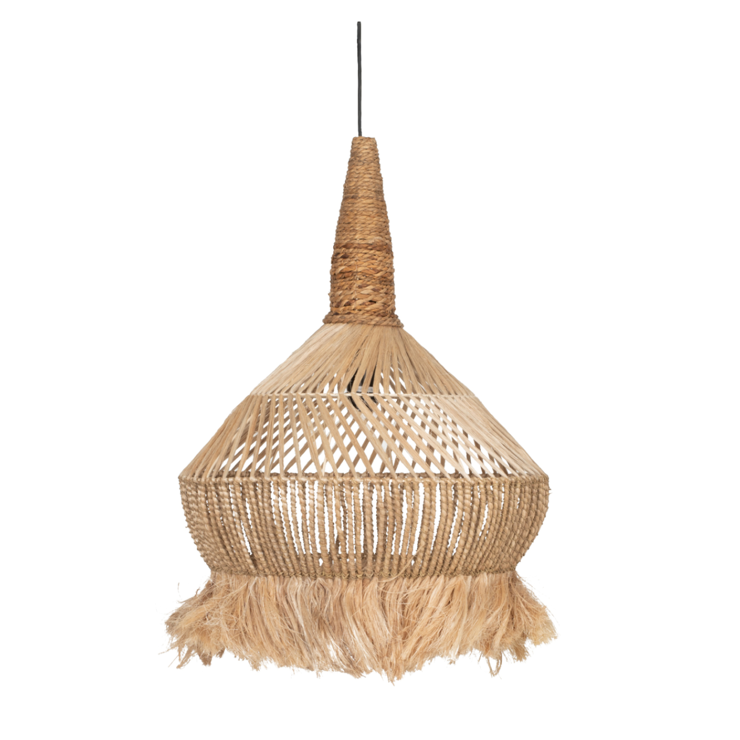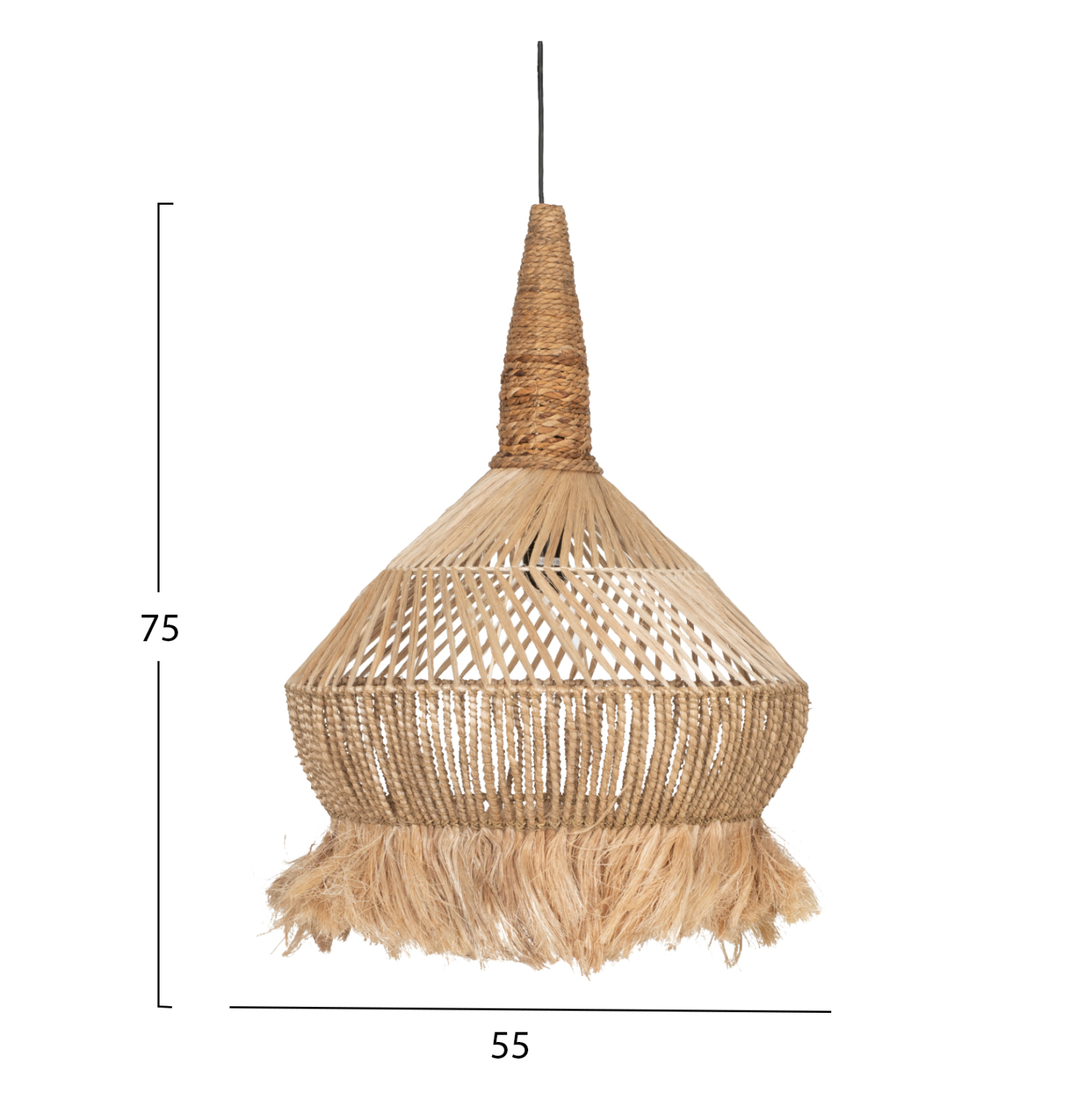Hm7774- Kρεμαστό φωτιστικό---- Αν επιθυμείτε να διακοσμήσετε το χώρο σας με ένα φωτιστικό σε boho στυλ, αυτό θα σας ενθουσιάσει. Είναι ένα μονόφωτο φωτιστικό με περίτεχνο «καπέλο» φτιαγμένο από σκοινί και ίνες κάνναβης Μανίλας και μπανάνας. Το ιδιαίτερο χαρακτηριστικό, όμως, αυτού του φωτιστικού είναι ότι το «καπέλο» καταλήγει σε κρόσια, επιτείνοντας ακόμα περισσότερο το boho στυλ.