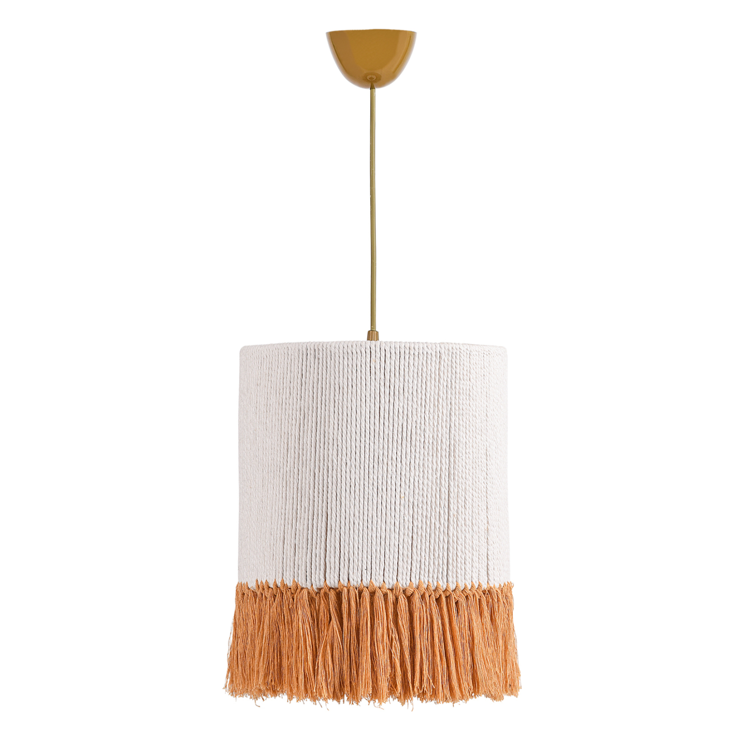 Hm7651.03- Kρεμαστό φωτιστικό---- Αν επιθυμείτε να διακοσμήσετε το χώρο σας με ένα φωτιστικό σε boho στυλ, αυτό είναι η πιο σωστή επιλογή. Είναι ένα μονόφωτο φωτιστικό με «καπέλο» σε σχήμα κυλίνδρου φτιαγμένο από ΛΕΥΚΟ λεπτό πλεκτό σκοινί, υψηλής ποιότητας και αντοχής στο χρόνο. Το ιδιαίτερο χαρακτηριστικό, όμως, αυτού του φωτιστικού είναι ότι το «καπέλο» καταλήγει σε κρόσια χρώματος ΜΠΕΖ, δίνοντας μια άλλη αίσθηση στον χώρο.