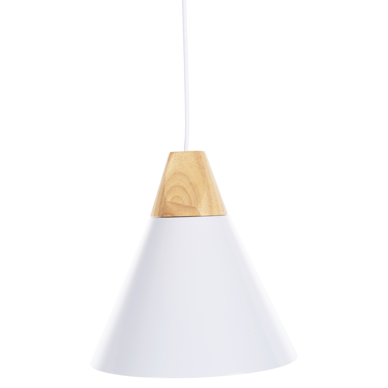 Ανακαλύψτε αυτό το νέο μας κρεμαστό φωτιστικό οροφής και ολοκληρώστε την διακόσμησή σας. Πρόκειται για ένα φωτιστικό με ΛΕΥΚΟ μεταλλικό καπέλο σε σχήμα κωνικής καμπάνας με λεπτομέρεια ξύλου στην κορυφή του φωτιστικού. Αισθητικά, ολοκληρώνεται με το επίσης ΛΕΥΚΟ καλώδιο κρέμασης και την λευκή βάση οροφής, και αποτελεί την τελευταία τάση στα φωτιστικά οροφής.