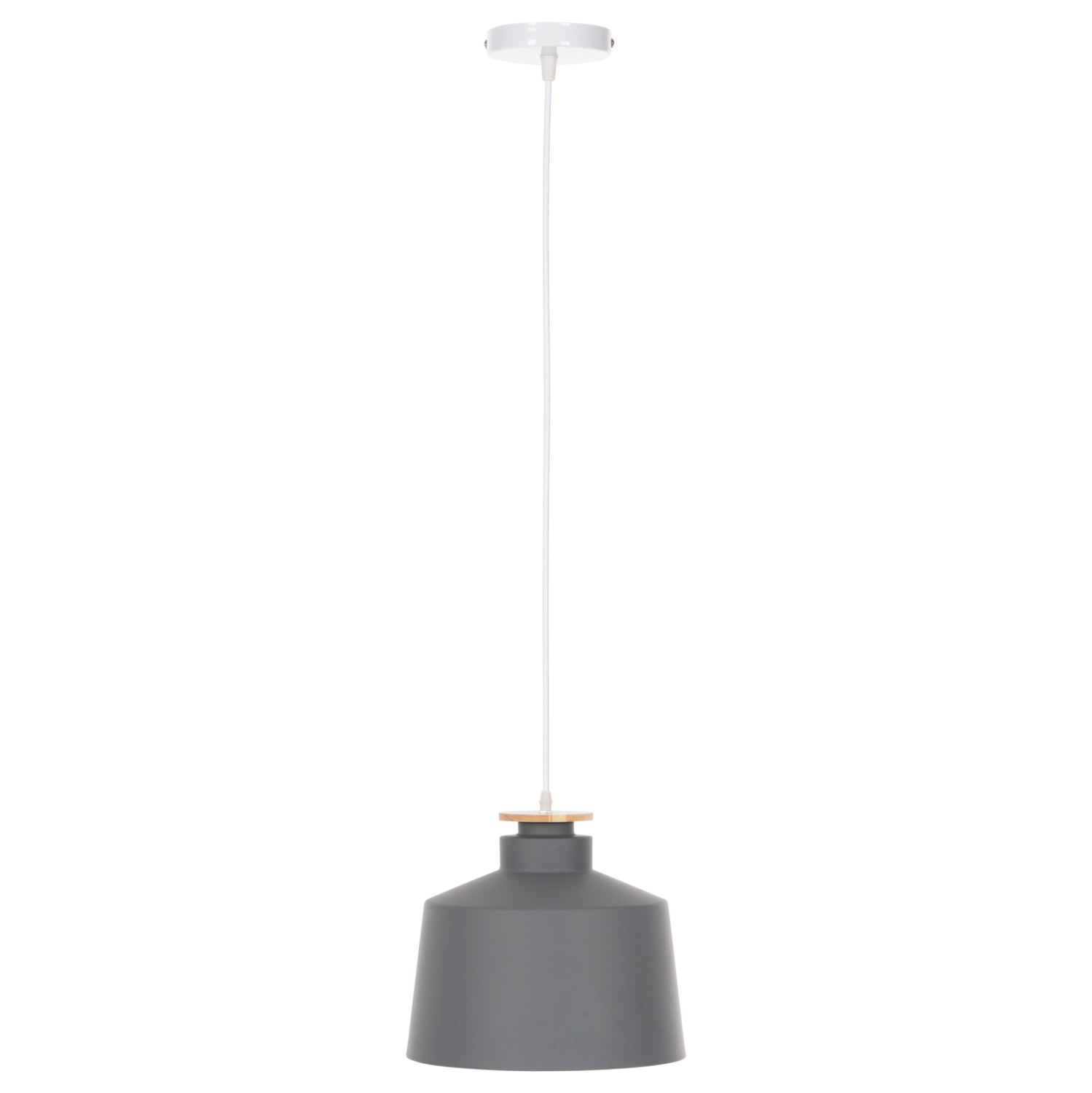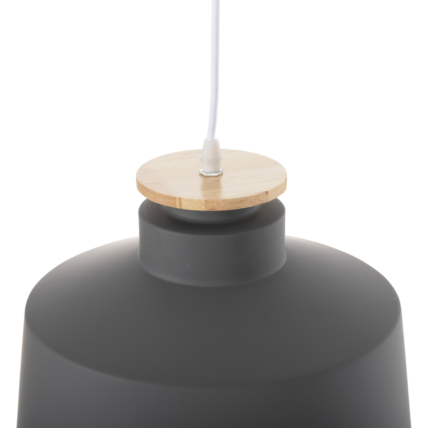 Ανακαλύψτε αυτό το νέο μας κρεμαστό φωτιστικό οροφής και ολοκληρώστε την διακόσμησή σας. Πρόκειται για ένα φωτιστικό με ΓΚΡΙ καπέλο ΑΛΟΥΜΙΝΙΟΥ σε σχήμα καμπάνας με λεπτομέρεια ξύλου στην κορυφή του φωτιστικού. Αισθητικά, ολοκληρώνεται με το λευκό καλώδιο κρέμασης και την λευκή βάση οροφής, και αποτελεί την τελευταία τάση στα φωτιστικά οροφής.