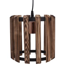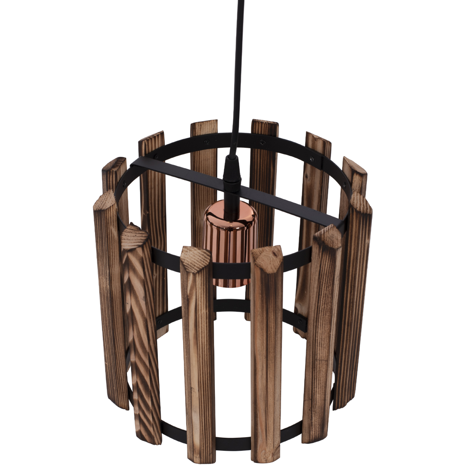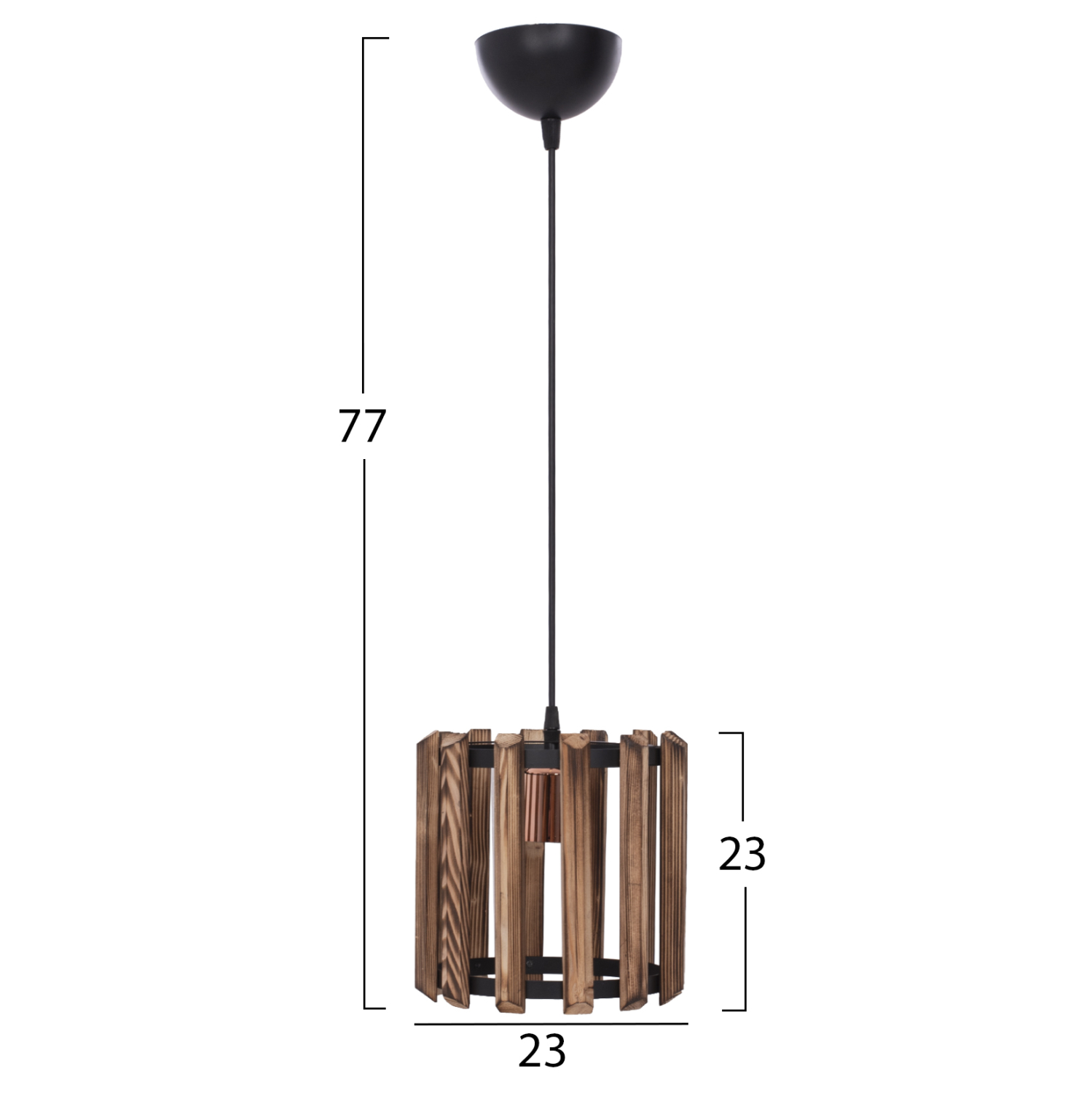 Hm7704.01-κρεμαστό φωτιστικό ----Αφήστε το φως να απλωθεί στον χώρο με ένα πρωτότυπο μονόφωτο οροφής, ολοκληρώνοντας την διακόσμησή σας. Το «καπέλο» του φωτιστικού αποτελείται από δύο μαύρους μεταλλικούς δακτυλίους πάνω στους οποίους είναι μονταρισμένες σε κάθετη διάταξη, ξύλινες βέργες σε φυσικό χρώμα. Το χαρακτηριστικό αυτού του φωτιστικού είναι ότι το ντουί της λάμπας είναι σε γυαλιστερό μπρούτζινο χρώμα, δημιουργώντας μια ιδιαίτερη διχρωμία με την υπόλοιπη κατασκευή.