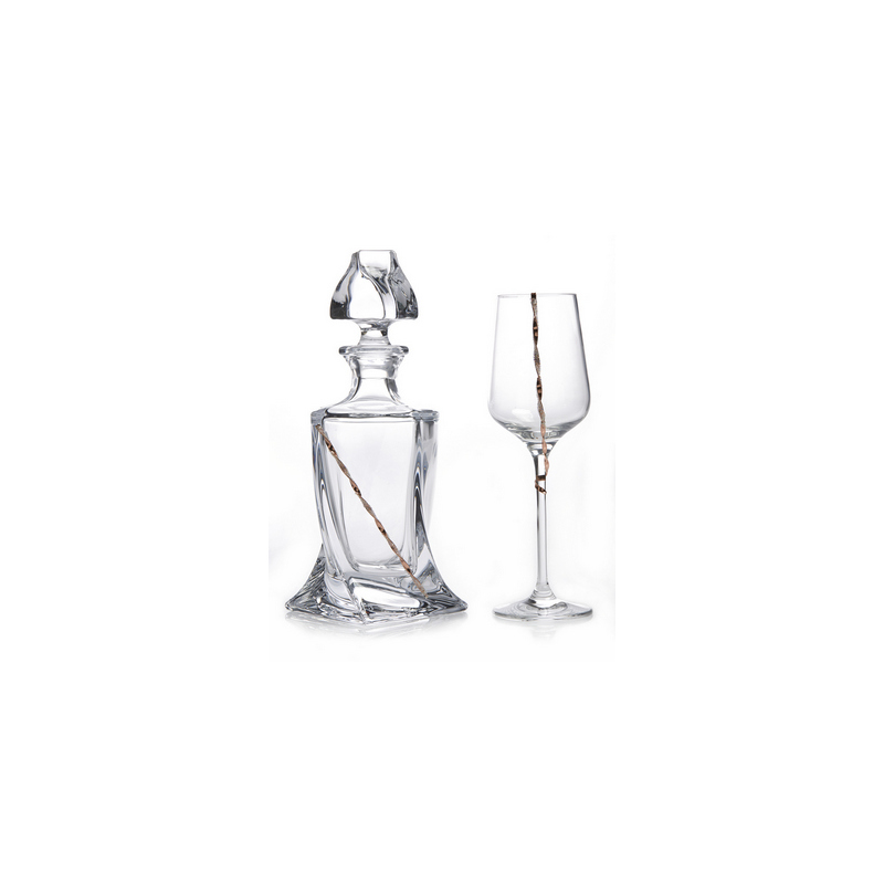 Σετ καράφα- ποτήρι γυάλινα στολισμένα με ροζ χρυσό γκλίτερ μέταλλο. Παράδοση σε 5-10 εργάσιμες μέρες.