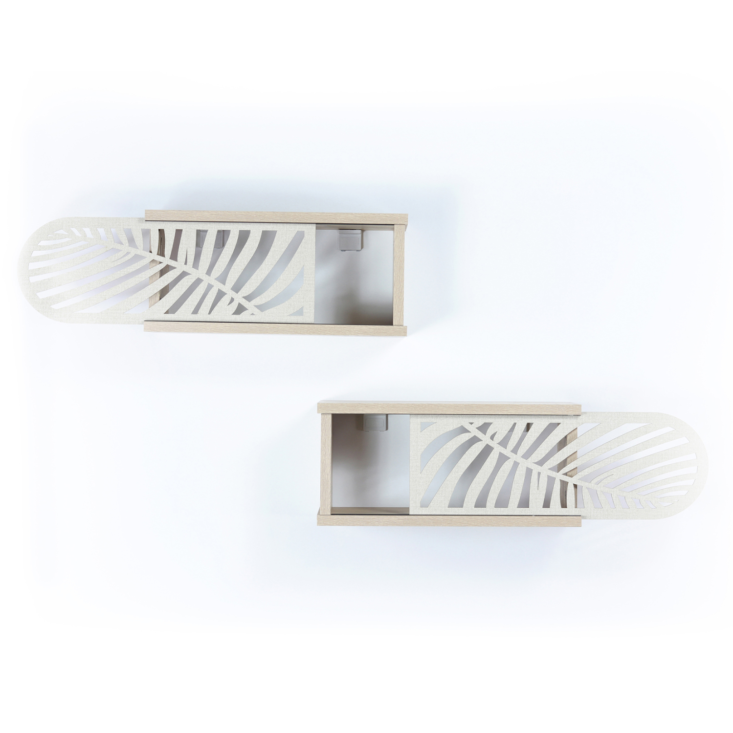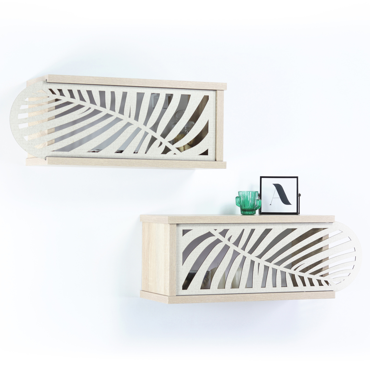 Σετ ράφια τοίχου με συρόμενα πορτάκια σε sonama απόχρωση με λεπτομέρειες σε εκρού χρώμα.