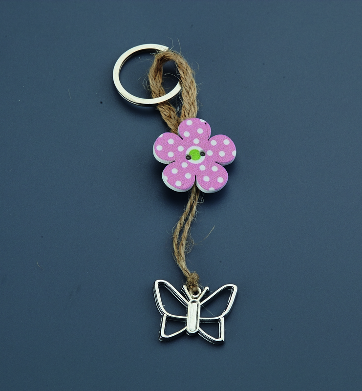 Μπρελόκ πεταλούδα σε ασημί χρώμα και ξύλινο λουλούδι. Διαστάσεις 12 εκ. Παράδοση σε 5-8 εργάσιμες μέρες. Nuova vita NU1511