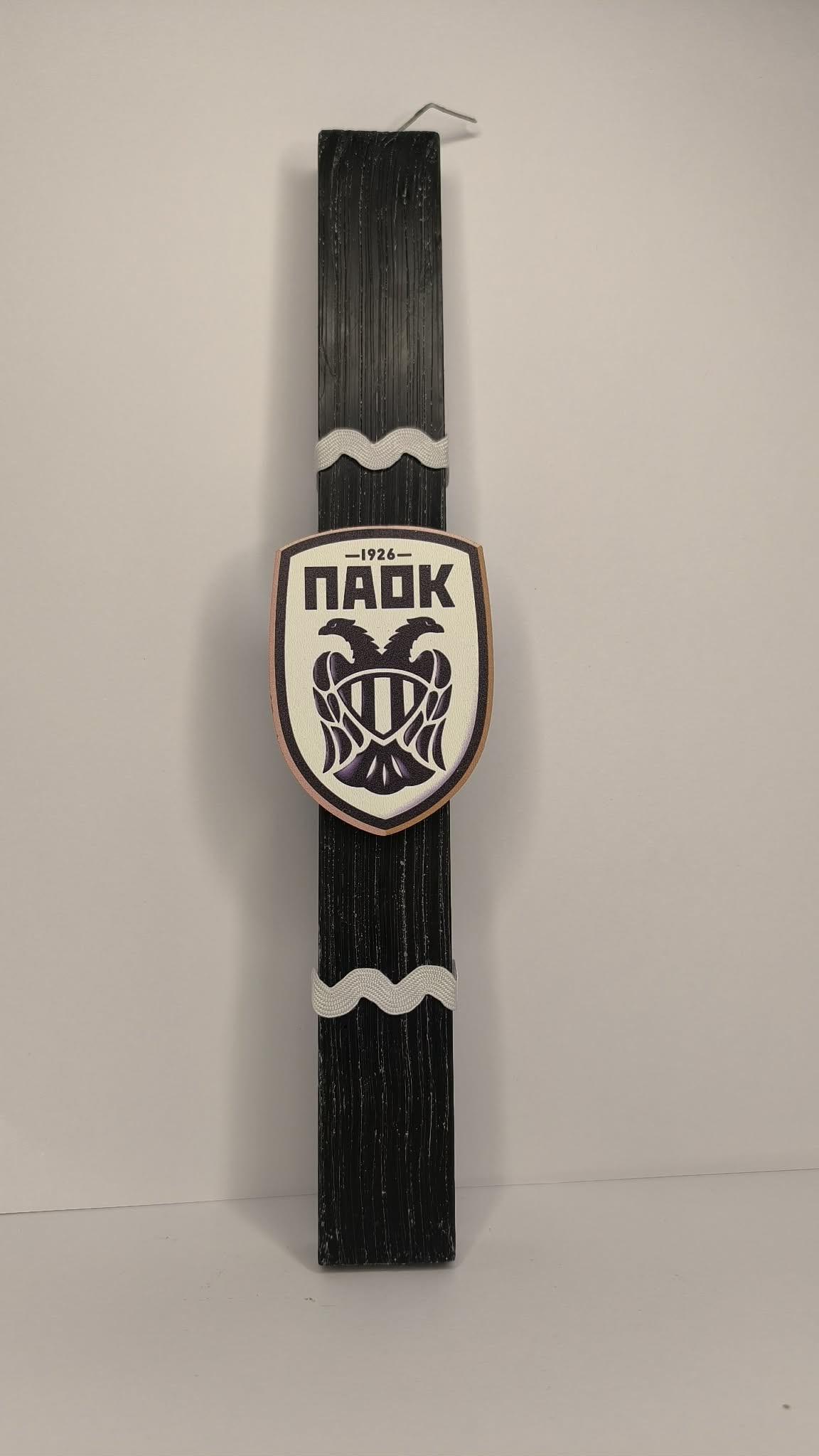 Λαμπάδα πλακέ ζαγρέ κερί μαύρο με διακοσμητικό ΠΑΟΚ.