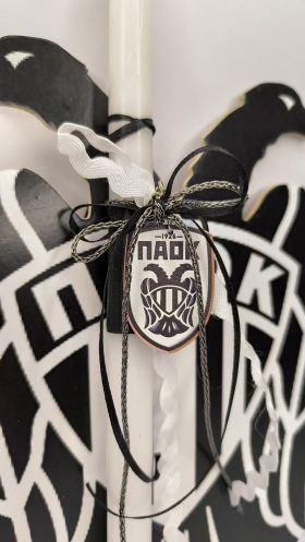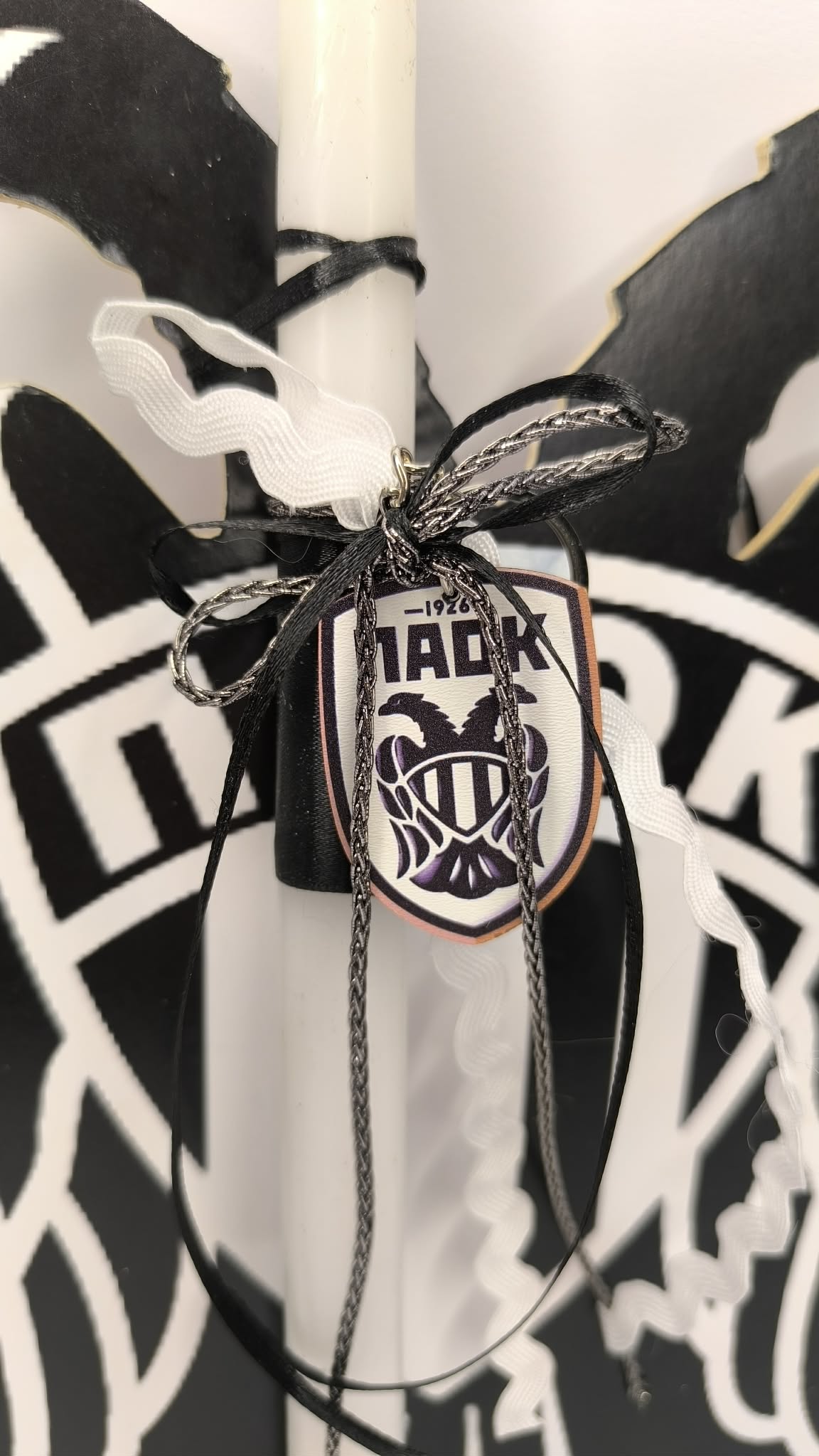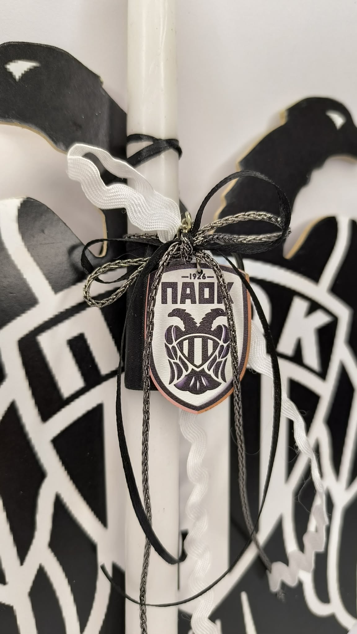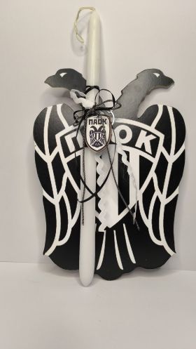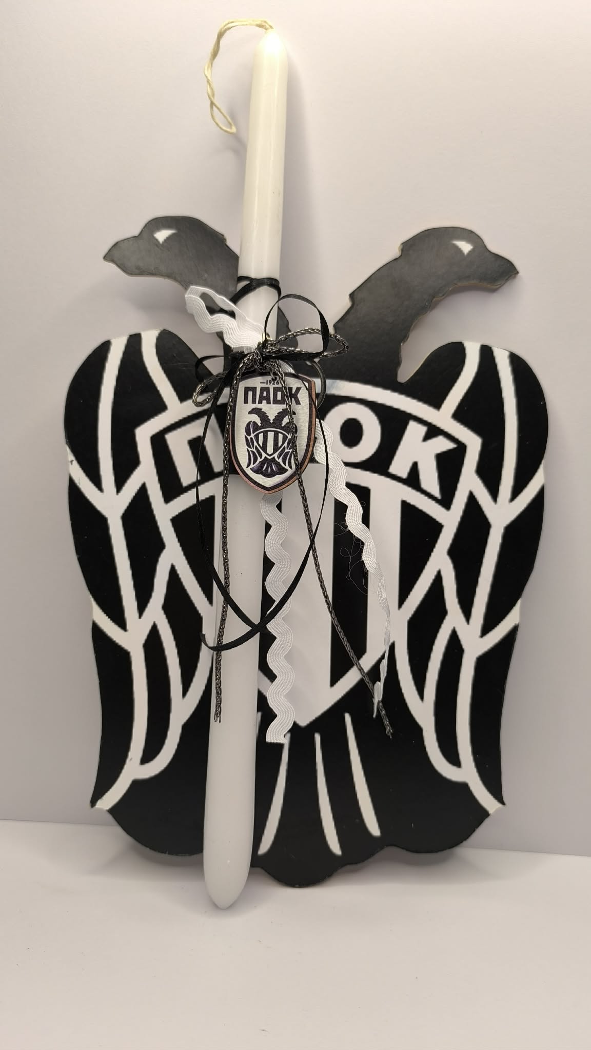 Λαμπάδα με μπρελόκ ΠΑΟΚ πάνω σε ξύλινη φιγούρα του δικέφαλου αετού, η οποία διαθέτει κορδονάκι πίσω για να κρεμαστεί και να χρησιμοποιηθεί ως διακοσμητικό δωματίου!