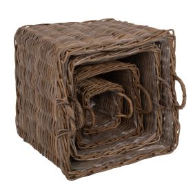 Τα διακοσμητικά καλάθια δαπέδου KATER θα δώσουν μια άλλη «οπτική» στον χώρο σας. Πρόκειται για 4 καλάθια με χερούλια διαφορετικών μεγεθών σε γκριζωπό χρώμα, με πλαστικά εσωτερικά καλύμματα. Είναι κατασκευασμένα από φυσικό Rattan (KUBU) και μπορούν να χρησιμοποιηθούν με πολλούς διαφορετικούς τρόπους, είτε ως καλάθια μεταφοράς πραγμάτων, είτε ως αποθηκευτικός χώρος, είτε ακόμα και ως γλάστρες.