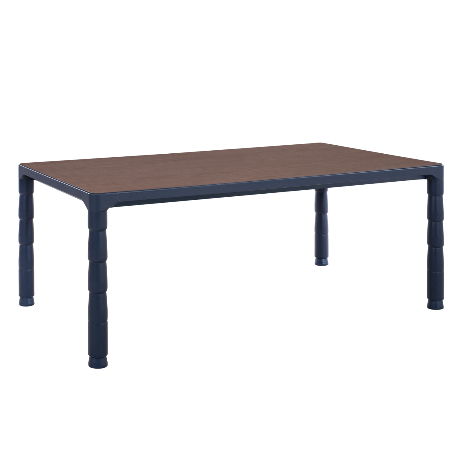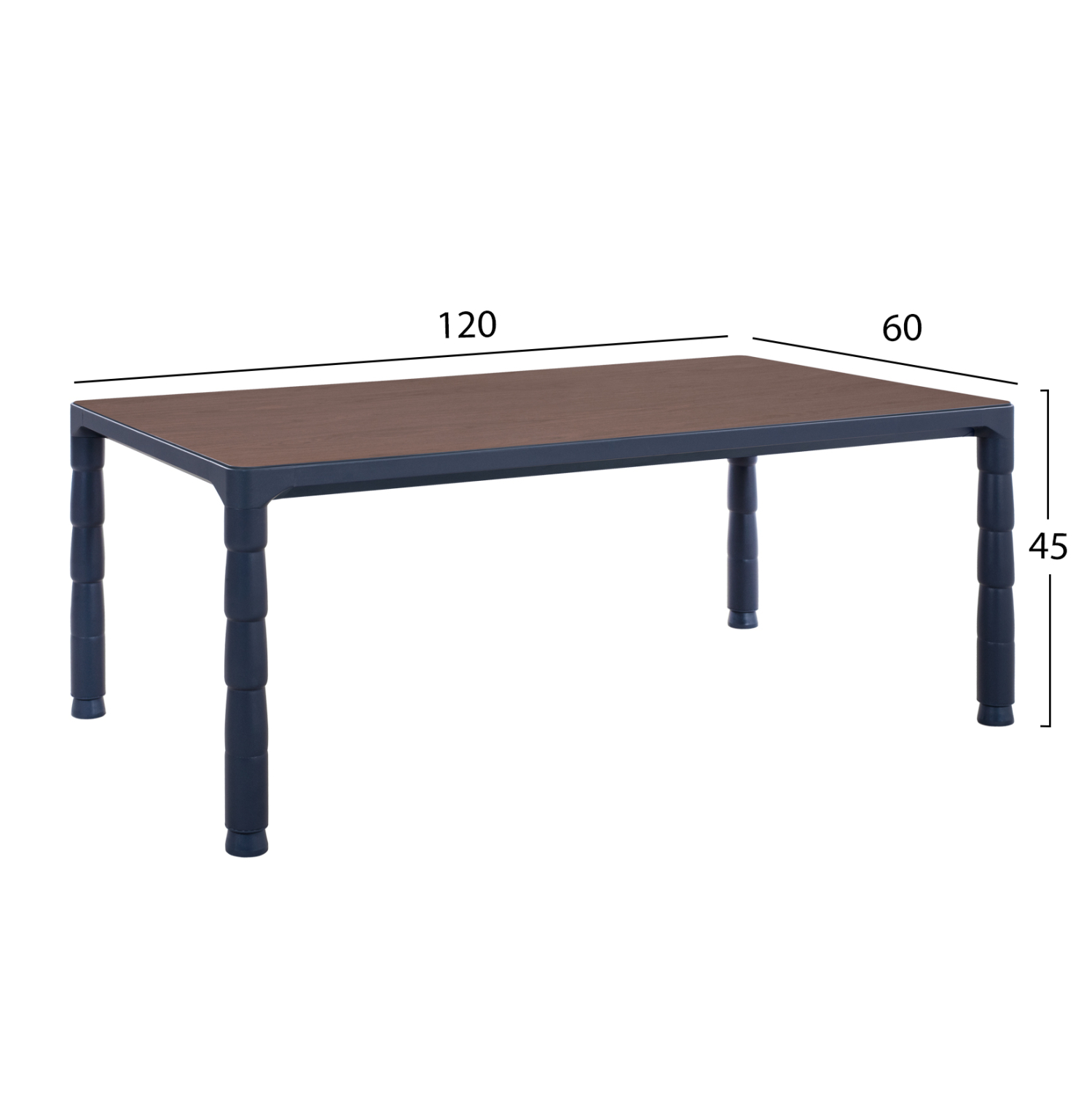 Επαγγελματικό τραπεζάκι σαλονιού επισκέπτου, κατασκευασμένο από μελαμίνη υψηλής ποιότητας σε καρυδί απόχρωση και βάση αλουμινίου σε σκούρο μπλε χρώμα.