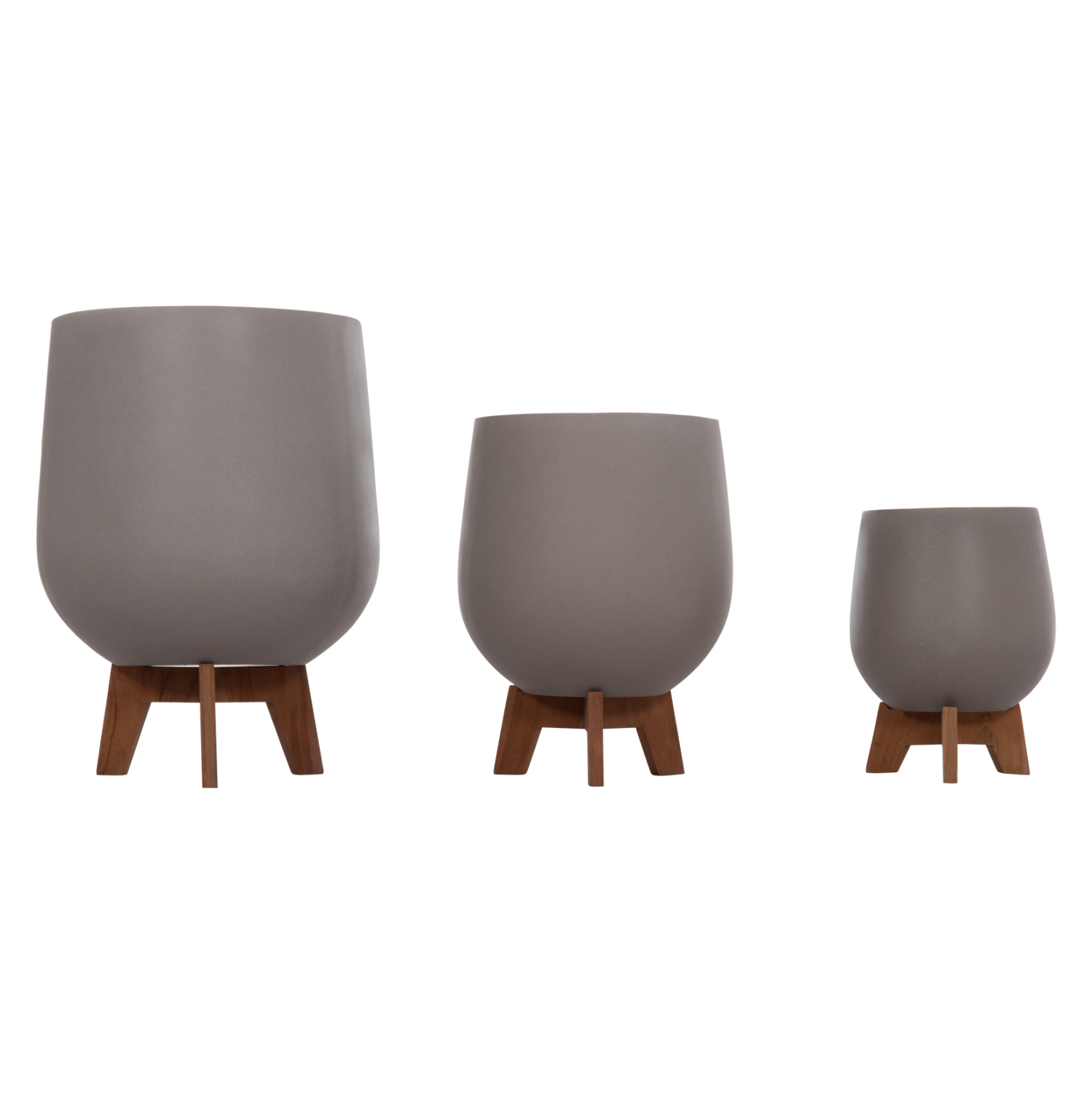 Οι 3 γλάστρες/βάζα TRYLL είναι κατασκευασμένες από Fiber Cement σε διαφορετικά μεγέθη σε ΓΚΡΙ χρώμα. Το ιδιαίτερο χαρακτηριστικό τους είναι ότι συνοδεύονται από όμορφες τρίποδες βάσεις από ξύλο TEAK.