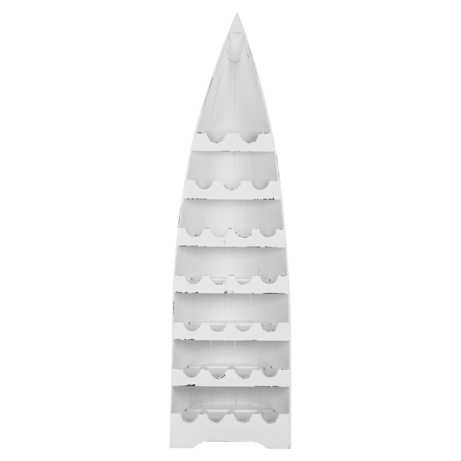 Η ξύλινη κάβα μπουκαλιών ΗΜ9494 σε λευκό αντίκ χρώμα, είναι χρησιμότατη για κάθε χώρο. Είναι κατασκευασμένη σε σχήμα βάρκας κάθετα στερεωμένης, με λαξευμένες αριστοτεχνικά 7 σειρές για τοποθέτηση 25 μπουκαλιών. Πρόκειται για μια πανέμορφη κατασκευή που αποτελεί τόσο κομμάτι διακόσμησης, όσο και πρακτικό αντικείμενο οργάνωσης και αποθήκευσης μπουκαλιών.
