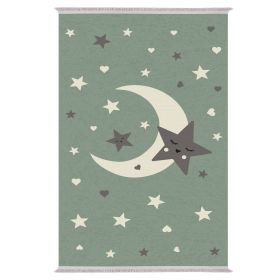 Αυτό το όμορφο χαλί με ΠΡΑΣΙΝΟ φόντο σε όλη την επιφάνεια του χαλιού, θα μαγνητίσει την φαντασία των μικρών μας φίλων. Το σχέδιο του χαλιού απεικονίζει έναν νυχτερινό ουρανό με ένα μισοφέγγαρο και πολλά αστεράκια και καρδούλες τριγύρω του.