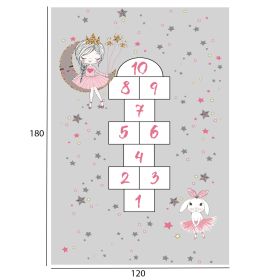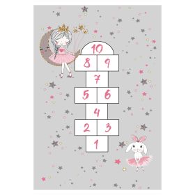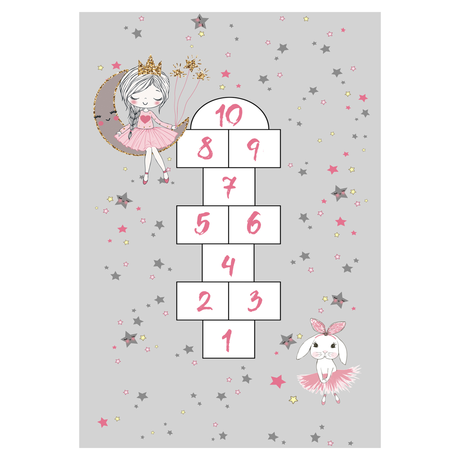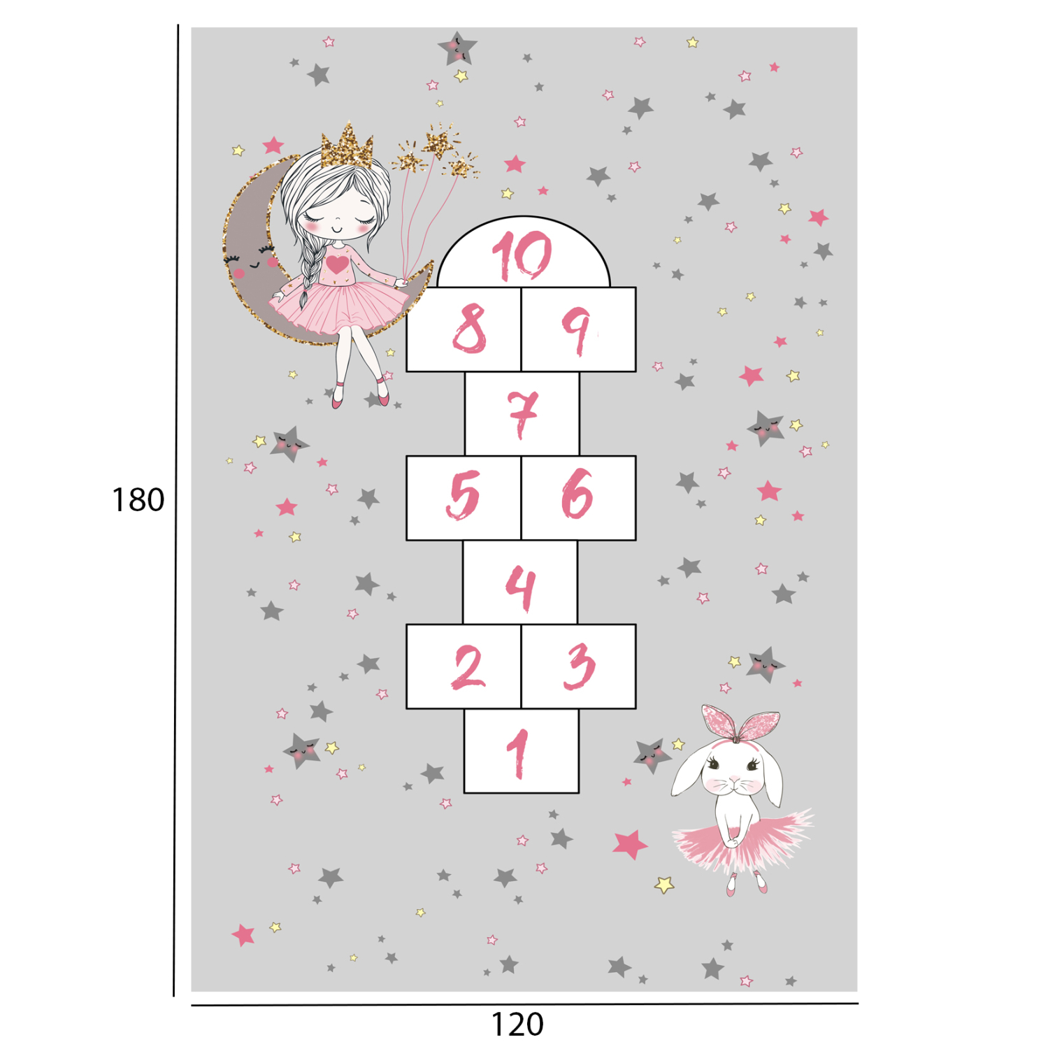Αυτό το όμορφο χαλί (κυρίως για κορίτσια) έχει κυρίαρχα χρώματα το ΓΚΡΙ σε όλη την επιφάνεια του χαλιού, και δεν διαθέτει μπορντούρα. Το σχέδιο του χαλιού απεικονίζει ένα κοριτσάκι να κάθεται σε ένα φεγγαράκι, ενώ το κυρίαρχο στοιχείο του χαλιού είναι μια όμορφη απεικόνιση του κλασικού παιχνιδιού «κουτσό». Άλλωστε, γιατί να μην είναι το ίδιο το χαλί… παιχνίδι;