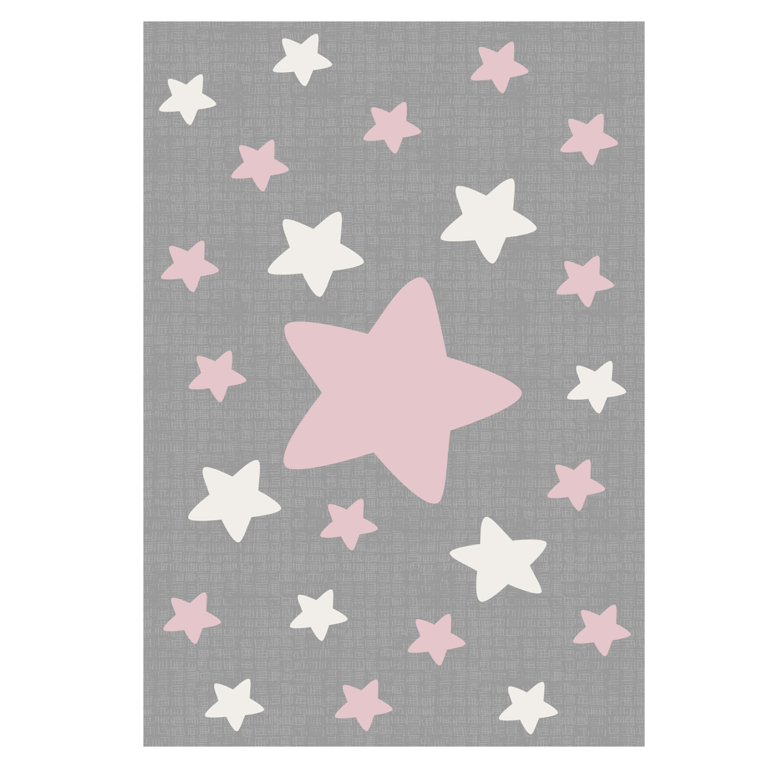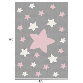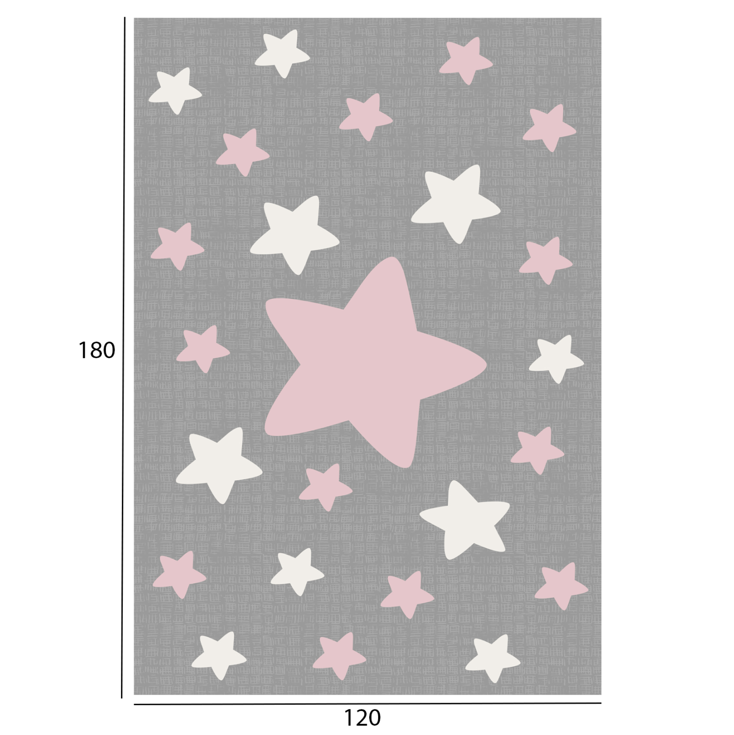 Αυτό το όμορφο χαλί έχει φόντο με κυρίαρχο χρώμα το γκρι σε όλη την επιφάνεια του χαλιού, και δεν διαθέτει μπορντούρα. Το σχέδιο του χαλιού είναι ευχάριστο και απεικονίζει αστέρια άσπρα και ροζ σε διάφορα μεγέθη.