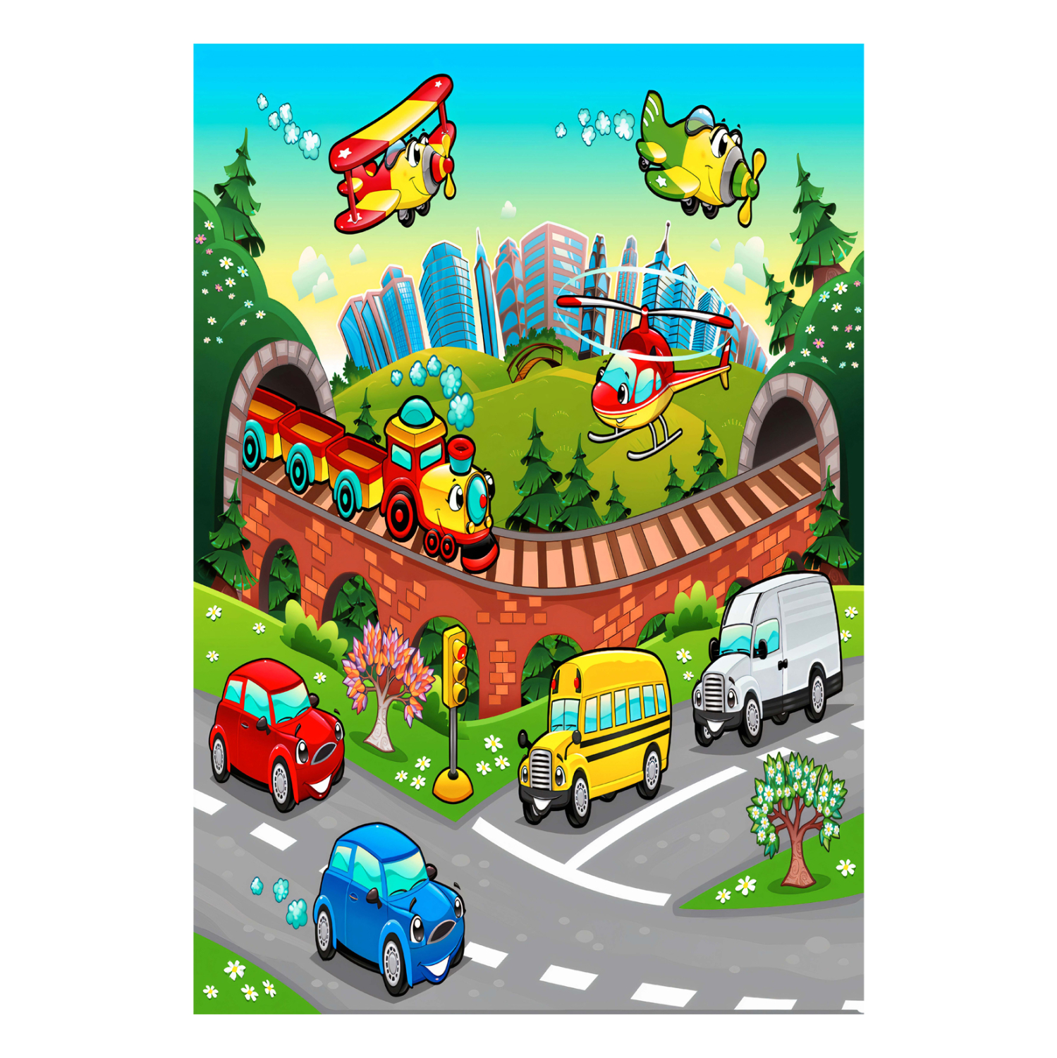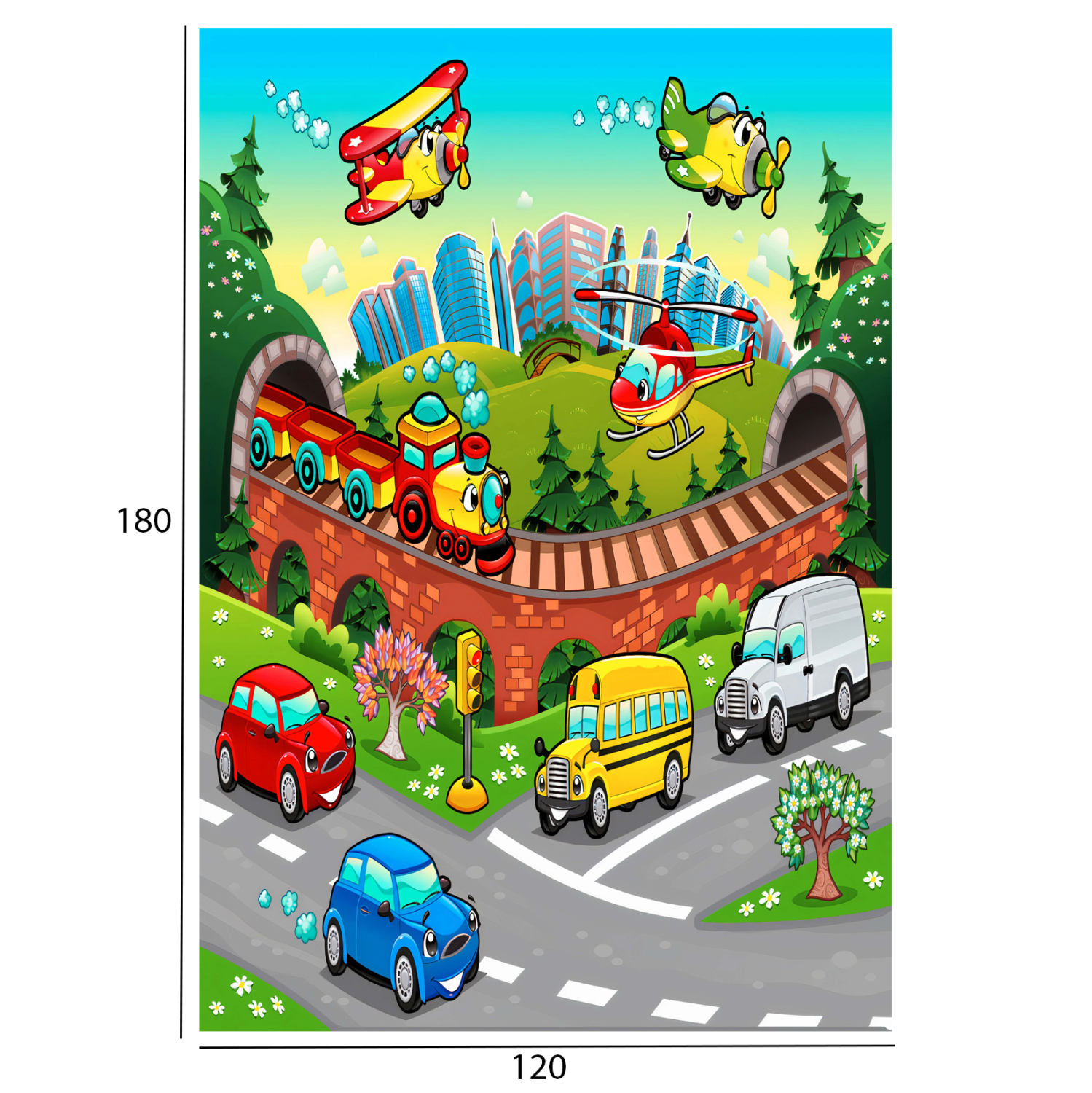 Αυτό το όμορφο χαλί είναι πολύχρωμο, και δεν διαθέτει μπορντούρα. Το σχέδιο του χαλιού είναι μια εικόνα που παραπέμπει σε κινούμενα σχέδια με αυτοκινητάκια, τρενάκια, αεροπλανάκια κι ελικοπτεράκια. Σίγουρα αυτό το χαλί θα γίνει αφορμή να περνάει ατελείωτες ώρες το παιδί πάνω του παίζοντας. Άλλωστε, η φαντασία των παιδιών θα συμπληρώσει άνετα το «σενάριο» του χαλιού!