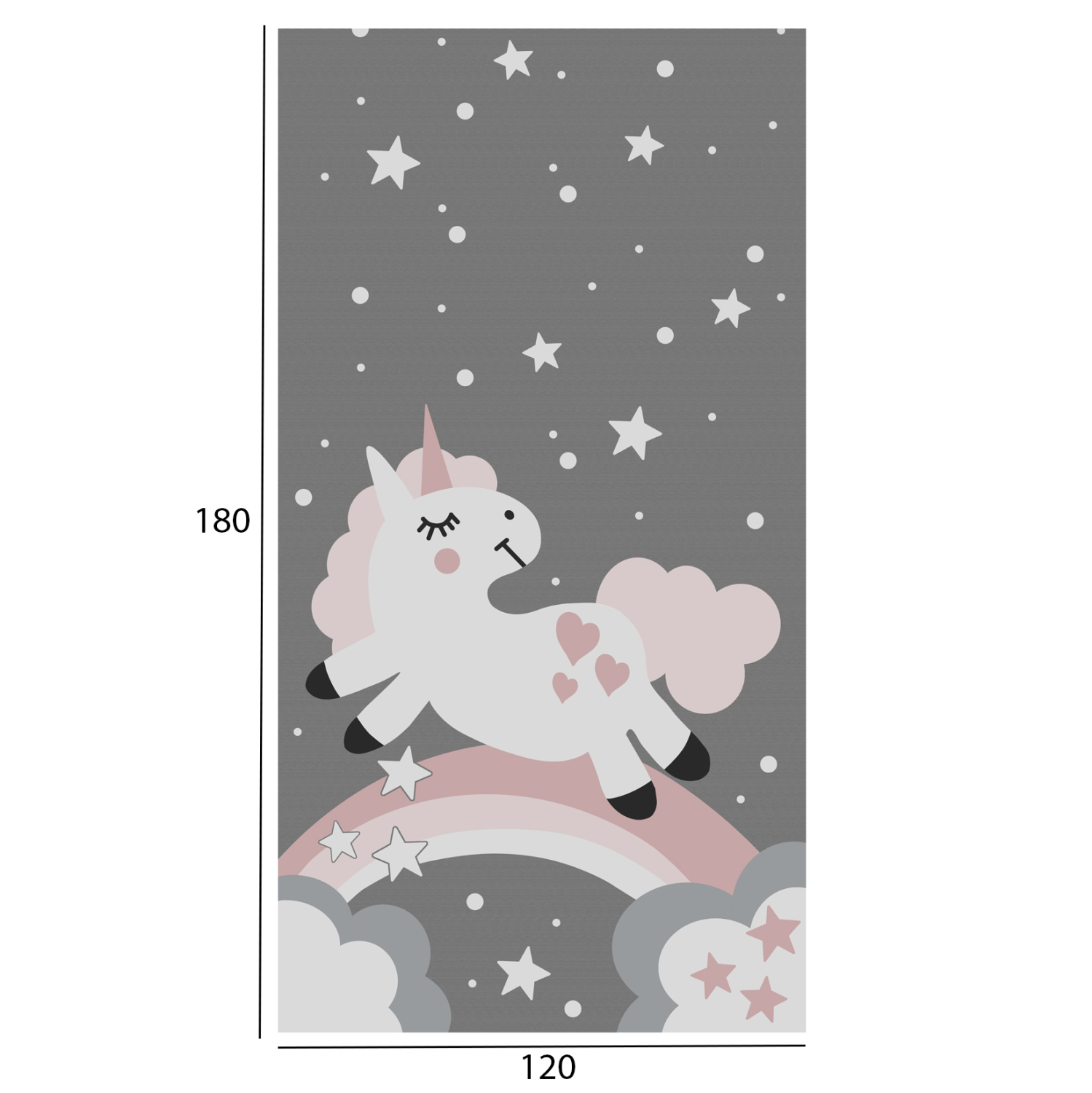 Αυτό το όμορφο χαλί έχει φόντο σε ΓΚΡΙ χρώμα σε όλη την επιφάνεια του χαλιού, και δεν έχει μπορντούρα. Το σχέδιο του χαλιού είναι μια όμορφη απεικόνιση ενός unicorn επάνω σε ένα ουράνιο τόξο στον έναστρο ουρανό. Στα μάτια των παιδιών ένα unicorn είναι κάτι το εξωτικό και είναι απίστευτη η έλξη τους για αυτή την ιδέα. Σίγουρα, θα αναβαθμίσει το παιδικό δωμάτιο του σπιτιού και θα του δώσει ένα εντελώς καινούριο look!