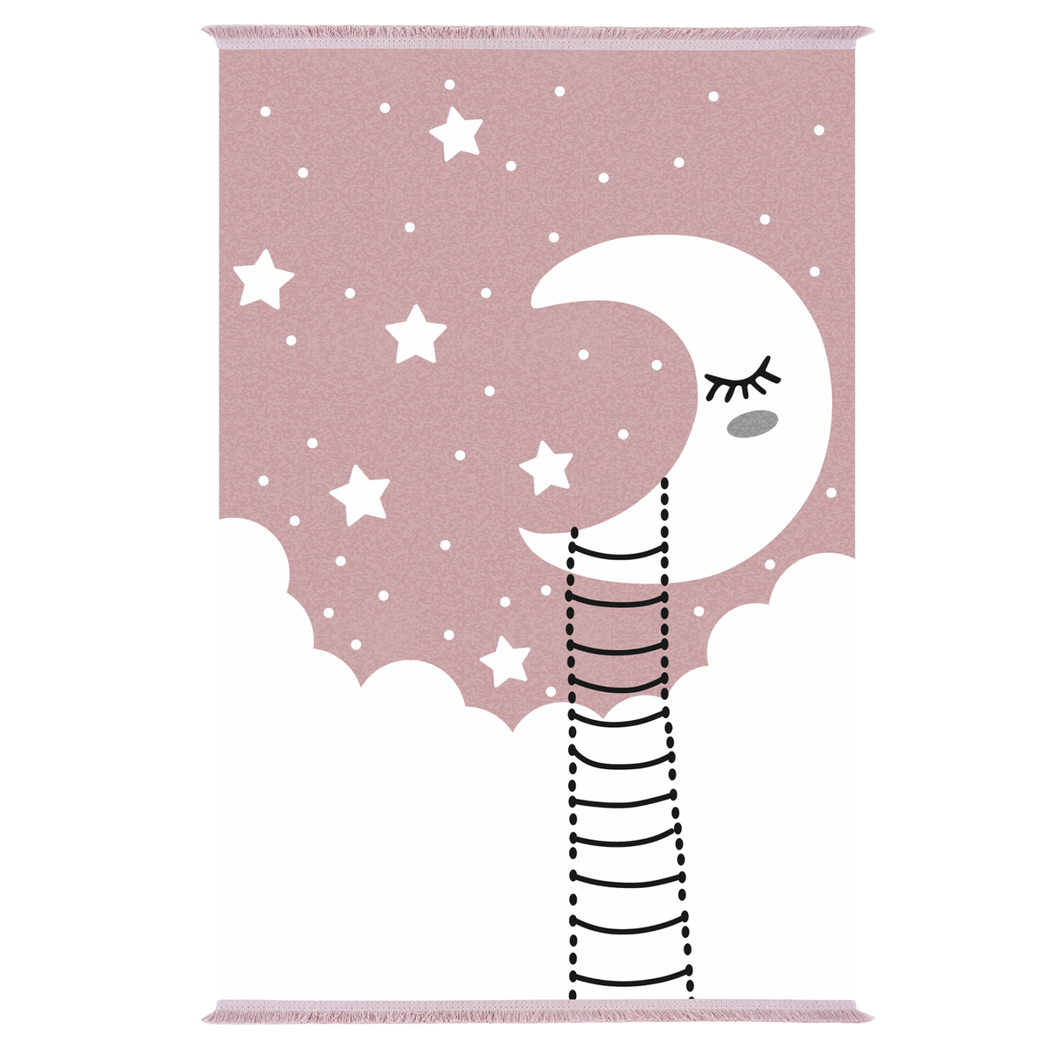 Αυτό το όμορφο χαλί με ΡΟΖ και ΑΣΠΡΟ φόντο σε όλη την επιφάνεια του χαλιού, θα μαγνητίσει την φαντασία των μικρών αλλά και των μεγάλων. Το σχέδιο του χαλιού απεικονίζει ένα κοιμώμενο μισοφέγγαρο και μια σκάλα που θα εξάψει την φαντασία των παιδιών!