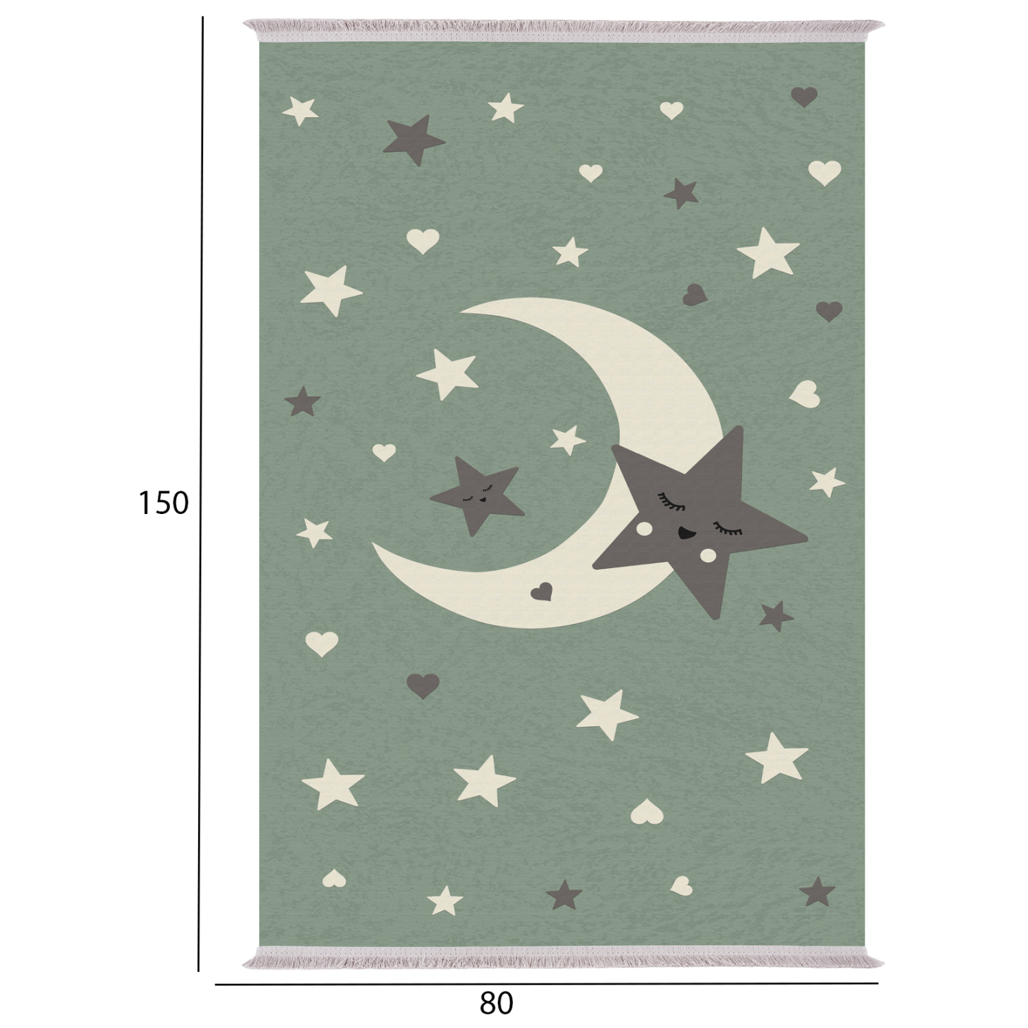 Αυτό το όμορφο χαλί με ΠΡΑΣΙΝΟ φόντο σε όλη την επιφάνεια του χαλιού, θα μαγνητίσει την φαντασία των μικρών μας φίλων. Το σχέδιο του χαλιού απεικονίζει έναν νυχτερινό ουρανό με ένα μισοφέγγαρο και πολλά αστεράκια και καρδούλες τριγύρω του.