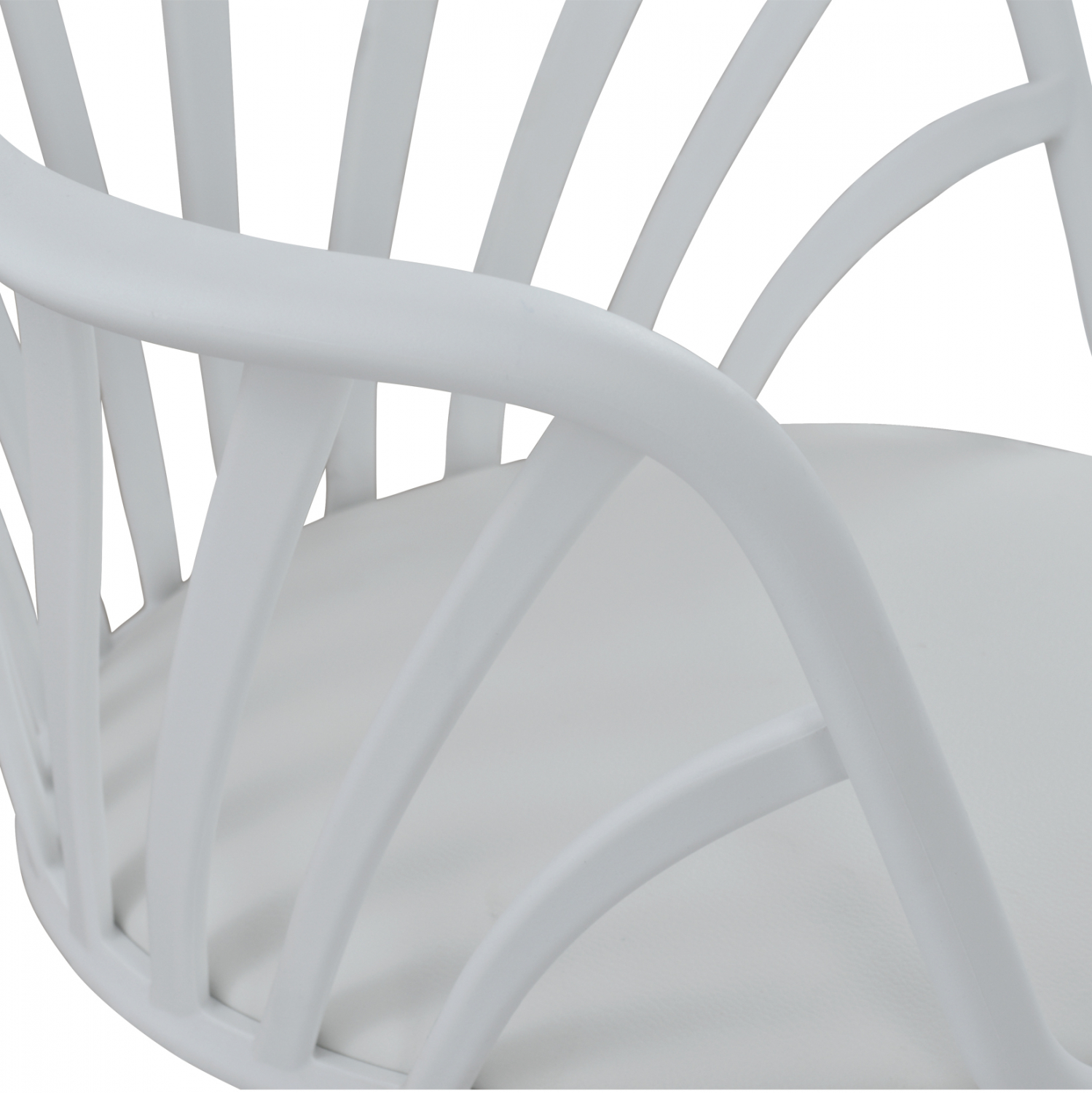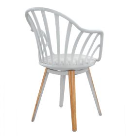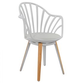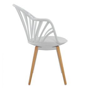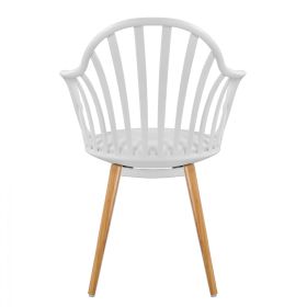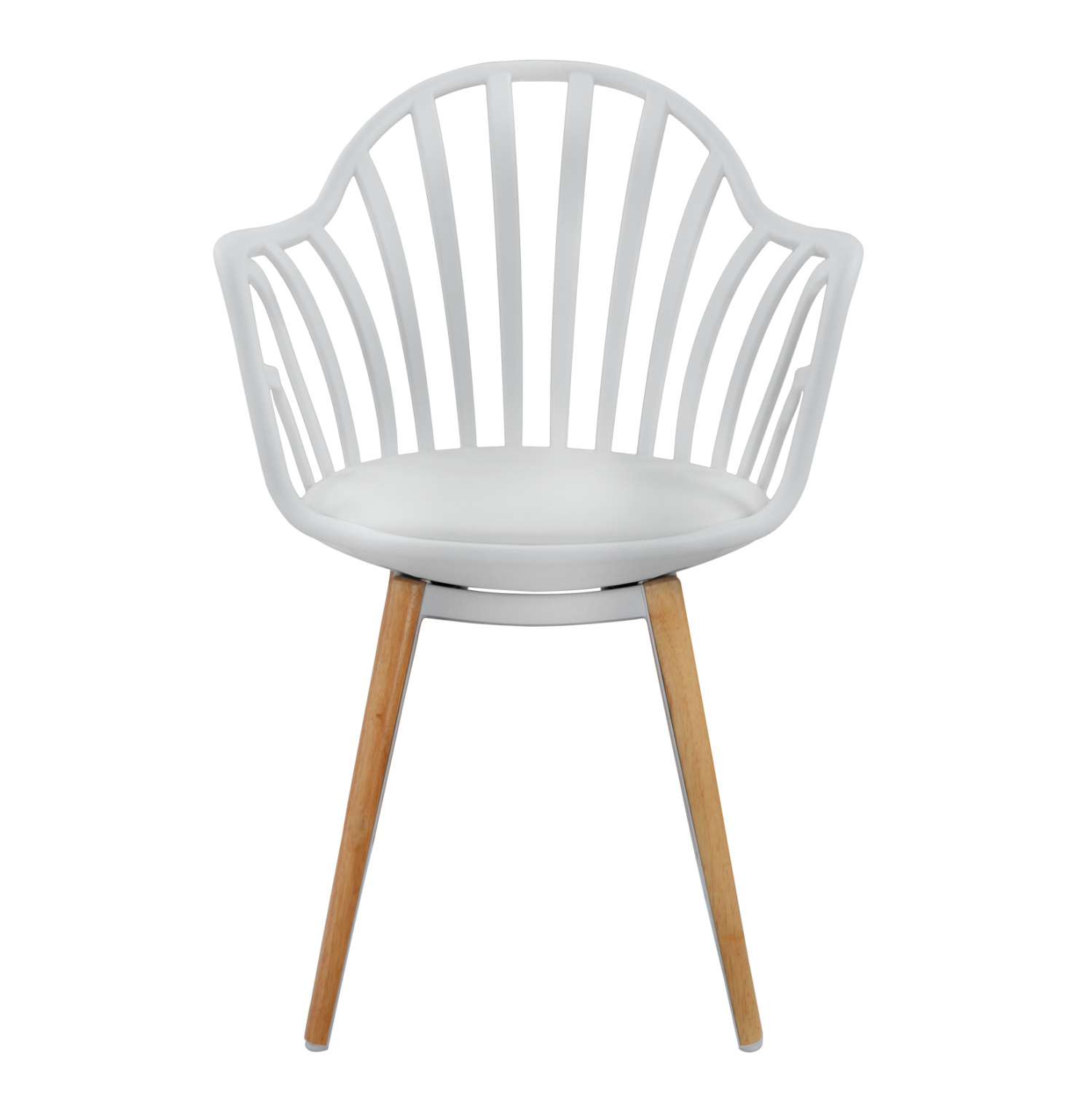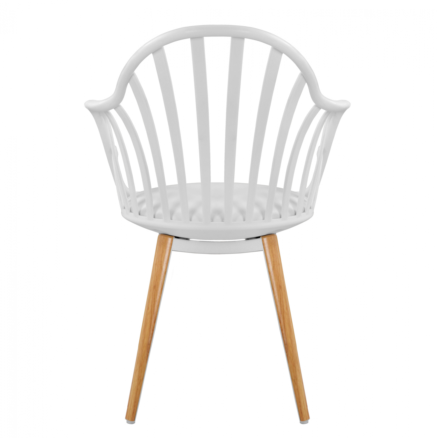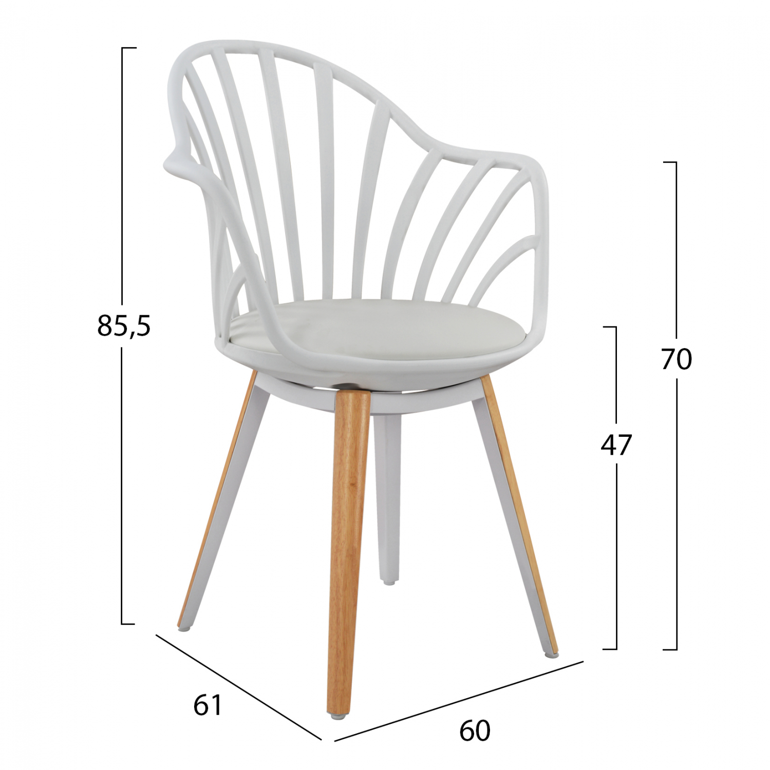 Πολυθρόνα τραπεζαρίας ANAIS, από πολυπροπυλένιο και κάθισμα από PU σε λευκό χρώμα, πόδια εσωτερικά από λευκό μεταλλικό σκελετό και εξωτερικά ντυμένα με ξύλινη επένδυση σε φυσική απόχρωση του ξύλου.