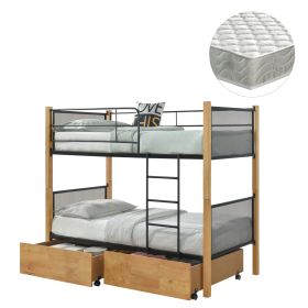 --Σας παρουσιάζουμε τo κρεβάτι-κουκέτα RAYVEN σε συνδυασμό ξύλου- μετάλλου για μονά στρώματα 90x190εκ. Τα 4 πόδια-κολώνες του κρεβατιού είναι τα ξύλινα κομμάτια της σύνθεσης σε χρώμα ΟΞΙΑΣ, ενώ το κεφαλάρι, το ποδαρικό, τα πλαϊνά, η σκάλα, τα κάγκελα, και οι τάβλες στήριξης του στρώματος είναι όλα μεταλλικά σε ΜΑΥΡΟ χρώμα. Η πρόσβαση στο επάνω κρεβάτι γίνεται με μια μεταλλική σκάλα που τοποθετείται βιδωτή στον σκελετό. Στο επάνω κρεβάτι υπάρχουν πλαϊνά προστατευτικά κάγκελα που προσφέρουν ασφάλεια από πτώσεις. Διαθέτει δύο συρτάρια δαπέδου με ροδάκια, που τοποθετούνται κάτω από το κρεβάτι, και διαθέτουν όμορφη πρόσοψη μελαμίνης σε χρώμα παρόμοιο με τον σκελετό του κρεβατιού.