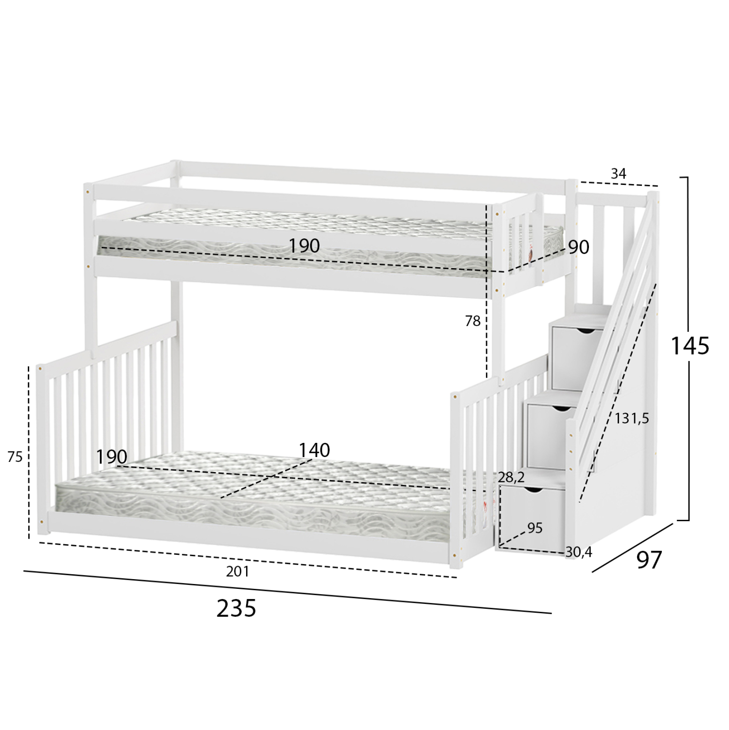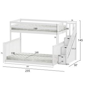Η παιδική κουκέτα BEAMER σε διάσταση για στρώματα 90 και 140x190εκ, είναι κατασκευασμένη από ξύλο πεύκου σε ΛΕΥΚΟ χρώμα. Η πρόσβαση στο επάνω κρεβάτι γίνεται με πρακτική πλαϊνή σκάλα, ενώ το κάτω κρεβάτι είναι μεγαλύτερο σε πλάτος και πατάει απευθείας στο πάτωμα. Τα στρώματα τοποθετούνται σε τάβλες από κόντρα-πλακέ ξυλεία.
