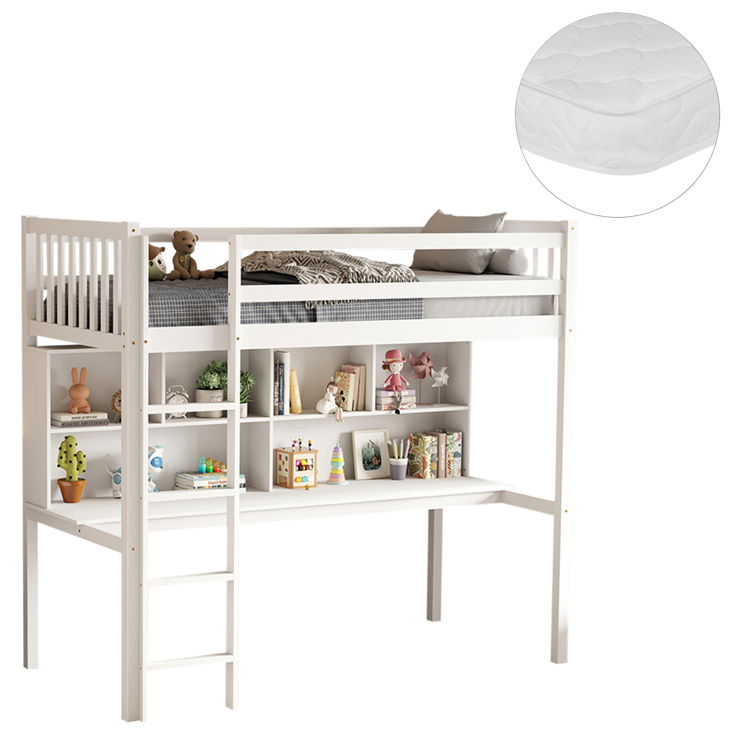 Η παιδική κουκέτα LIBRO σε διάσταση για στρώμα 90x190εκ, είναι κατασκευασμένη από ξύλο πεύκου σε ΛΕΥΚΟ χρώμα. Η πρόσβαση στο κρεβάτι γίνεται με πρακτική κάθετη σκάλα, ενώ το κάτω μέρος είναι διαμορφωμένο ως βιβλιοθήκη με χώρο για γραφείο. Το στρώμα τοποθετείται σε τάβλες από κόντρα-πλακέ ξυλεία.