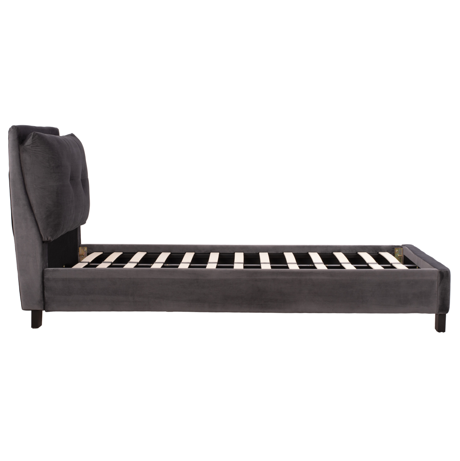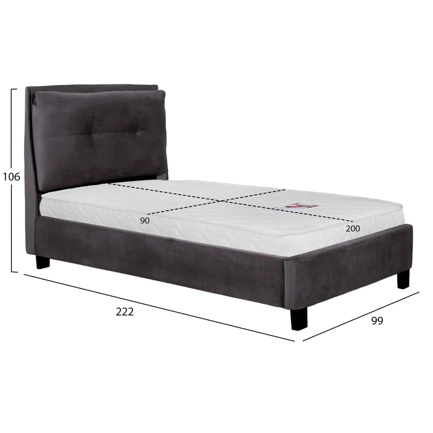 Το μονό κρεβάτι RILEY είναι επενδυμένο με βελούδο σε ΓΚΡΙ χρώμα. Το στρώμα (διατίθεται σε ROLL-PACKING*) που συνοδεύει το κρεβάτι τοποθετείται σε δύο σειρές ανατομικές τάβλες, είναι διπλής όψης και είναι ΑΦΡΟΥ χωρίς ελατήρια. Τα πόδια είναι σχετικά ψηλά από πολυπροπυλένιο σε μαύρο χρώμα.