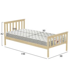 Το παιδικό κρεβάτι GIMLY σε διάσταση για στρώμα 90x190 εκ, είναι κατασκευασμένο από ξύλο πεύκου σε ΦΥΣΙΚΟ χρώμα, με ψηλά πόδια, ενώ το στρώμα τοποθετείται σε τάβλες από κόντρα-πλακέ ξυλεία.
