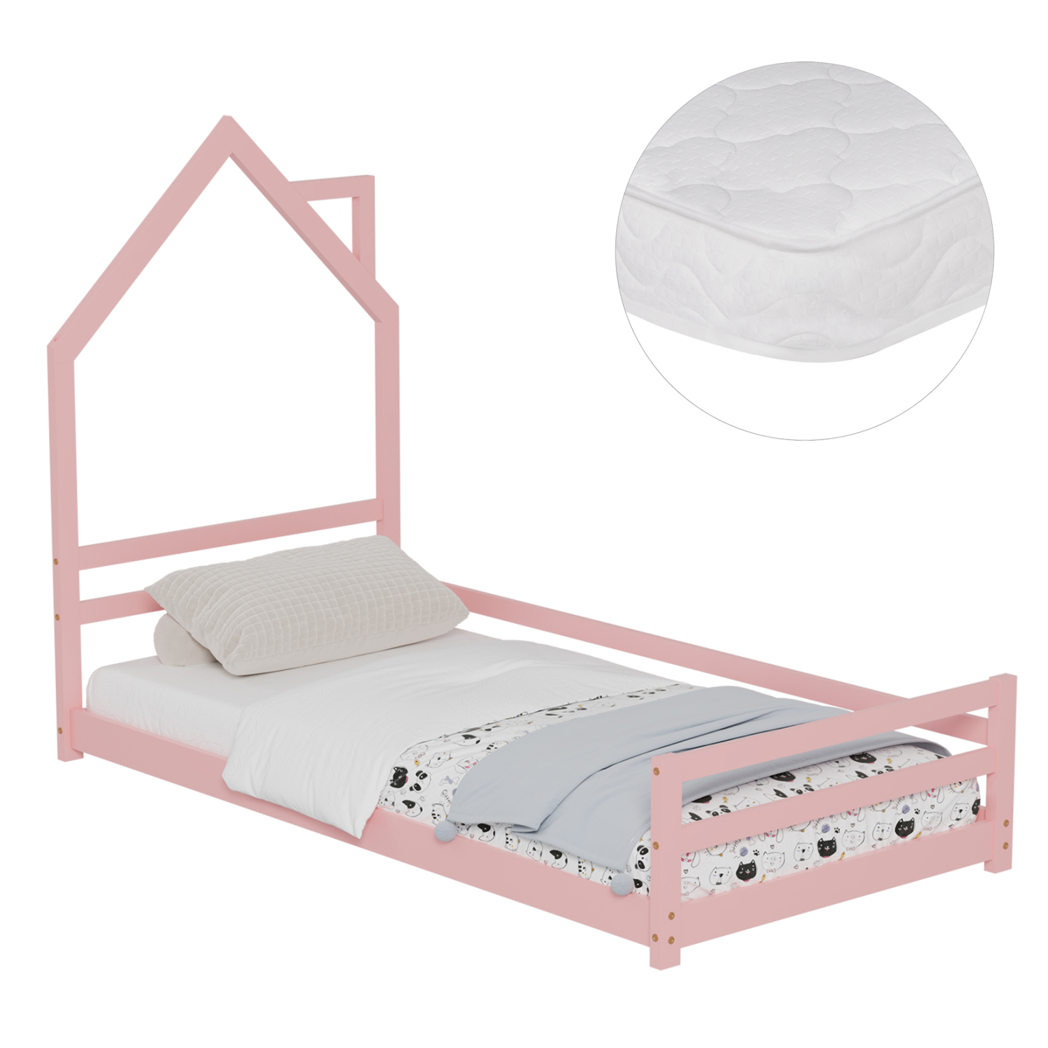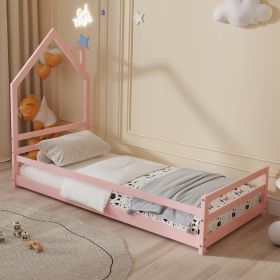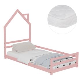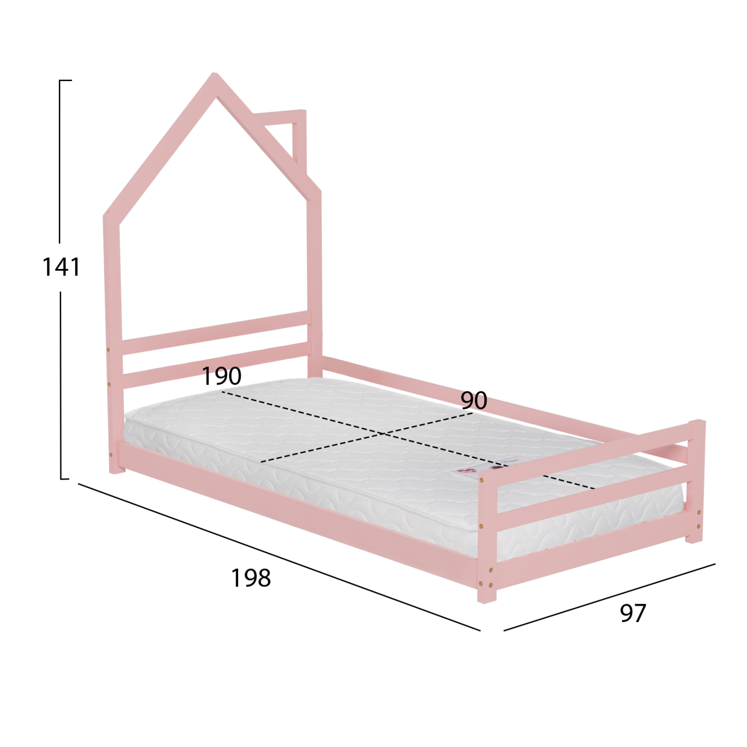 Το παιδικό κρεβάτι HOUSER τύπου Montessori σε διάσταση για στρώμα 90x190εκ, είναι κατασκευασμένο από ξύλο πεύκου σε ΡΟΖ χρώμα. Tο κεφαλάρι έχει σχήμα σπιτιού με καμινάδα και τα πόδια είναι εξαιρετικά χαμηλά, ενώ το στρώμα τοποθετείται σε τάβλες από κόντρα-πλακέ ξυλεία.