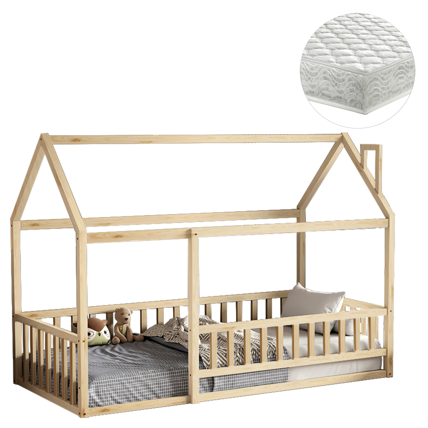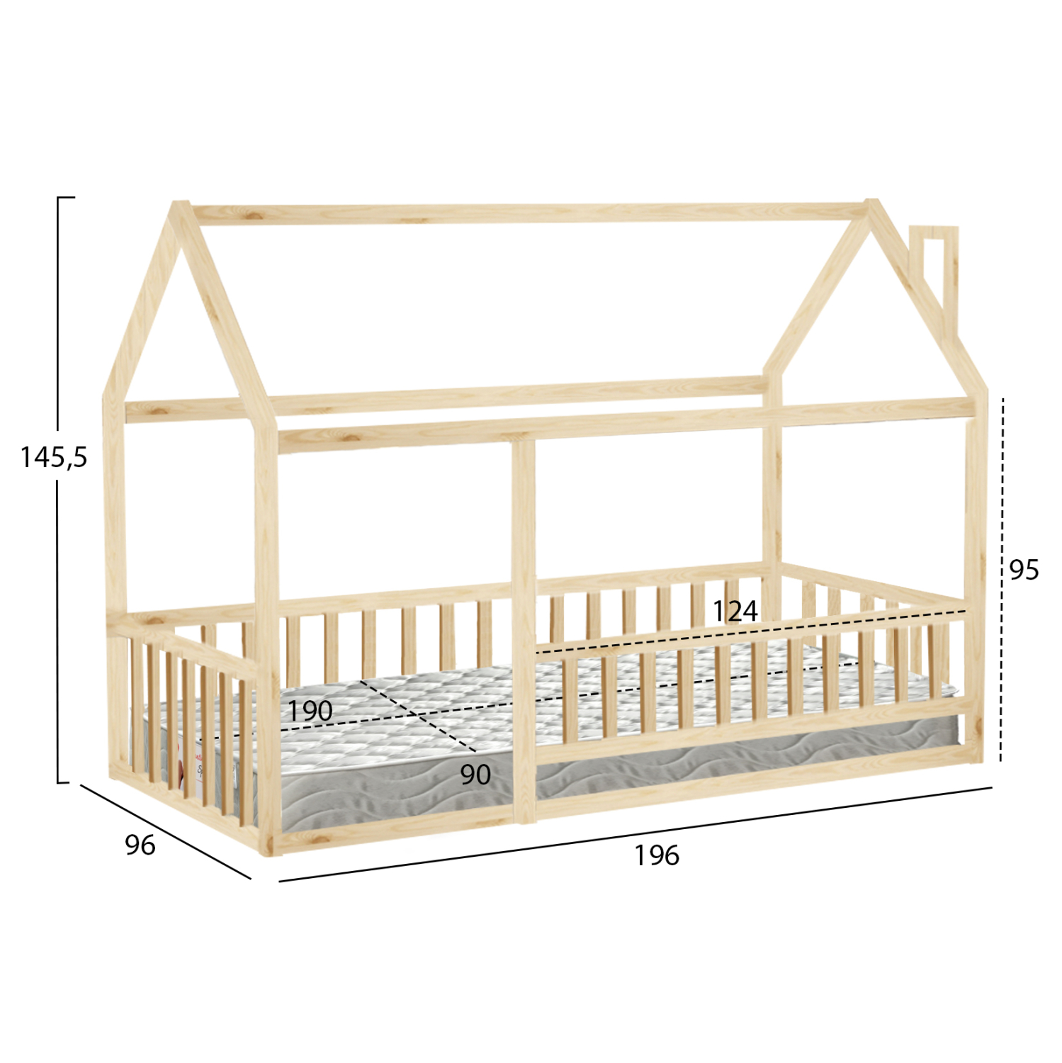 Το παιδικό κρεβάτι HOUSER τύπου Montessori σε διάσταση για στρώμα 90x190εκ, είναι κατασκευασμένο από ξύλο πεύκου σε ΦΥΣΙΚΟ χρώμα. Όλο το κρεβάτι που πατάει στο πάτωμα έχει σχήμα σπιτιού με καμινάδα και περιμετρικά κάγκελα, ενώ το στρώμα τοποθετείται σε τάβλες από κόντρα-πλακέ ξυλεία.
