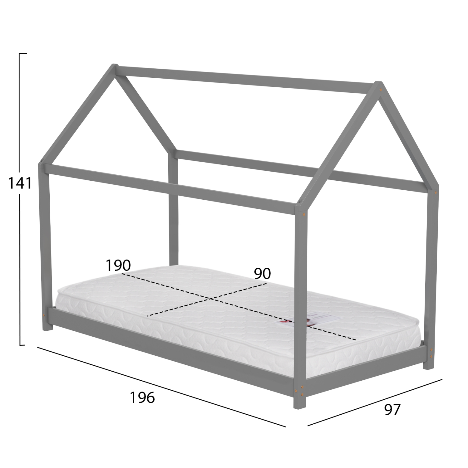 Το παιδικό κρεβάτι PEPE τύπου Montessori σε διάσταση για στρώμα 90x190εκ, είναι κατασκευασμένο από ξύλο πεύκου σε ΓΚΡΙ χρώμα. Όλο το κρεβάτι έχει σχήμα σπιτιού με εξαιρετικά χαμηλά πόδια, ενώ το στρώμα τοποθετείται σε τάβλες από κόντρα-πλακέ ξυλεία.