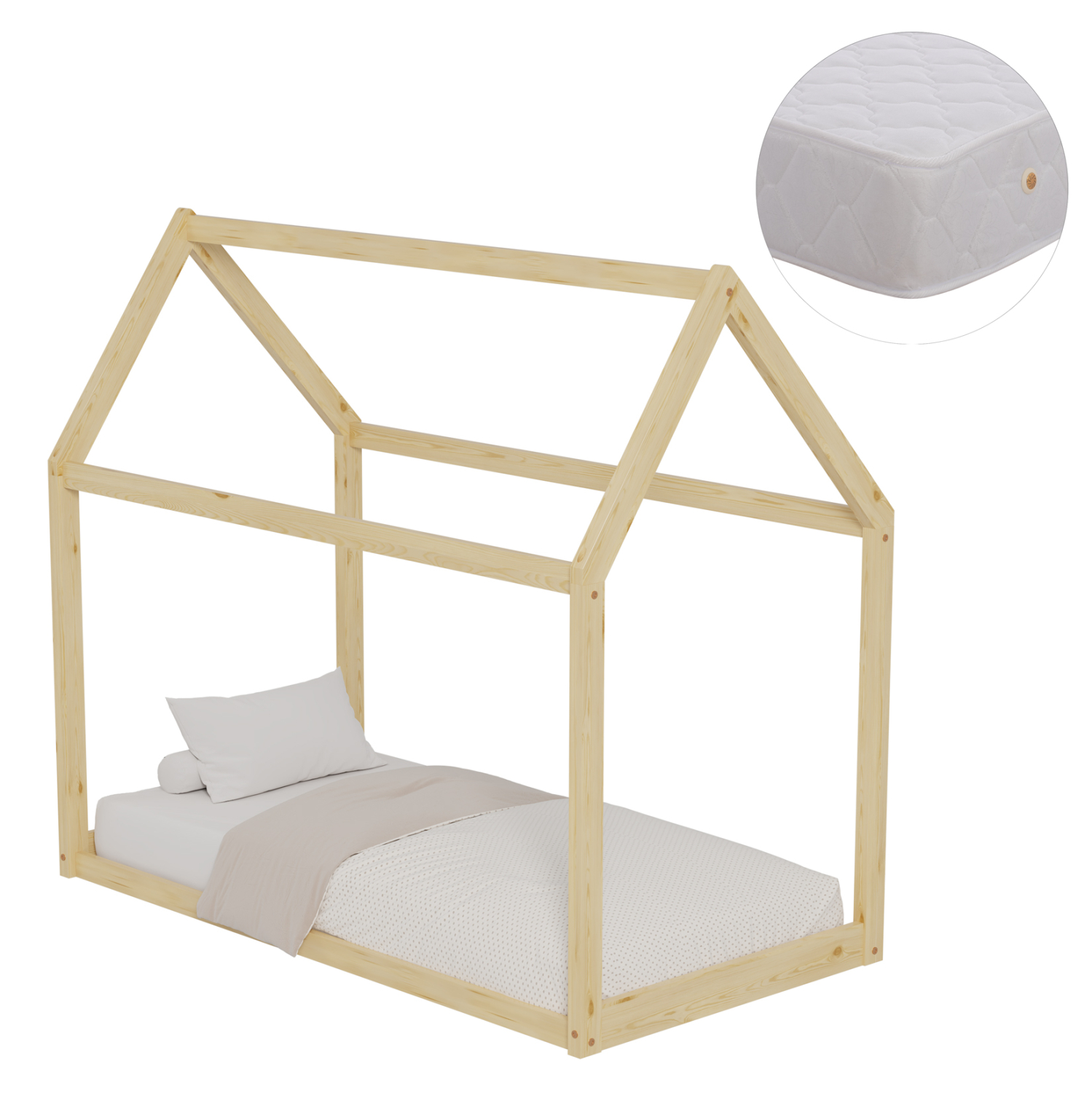 Το μικρό παιδικό κρεβάτι PEPE τύπου Montessori σε διάσταση για στρώμα 70x140εκ, είναι κατασκευασμένο από ξύλο πεύκου σε ΦΥΣΙΚΟ χρώμα. Όλο το κρεβατάκι έχει σχήμα σπιτιού και πατάει απευθείας στο έδαφος, ενώ το στρώμα τοποθετείται σε τάβλες από κόντρα-πλακέ ξυλεία.