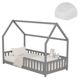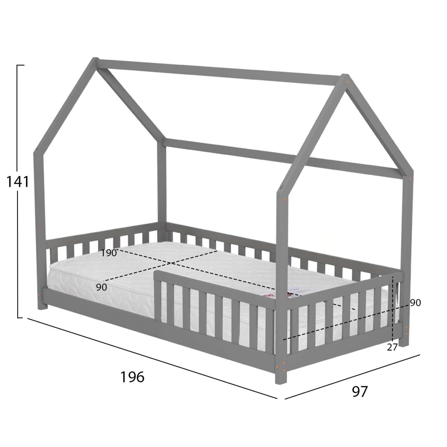 Το παιδικό κρεβάτι PHYLLIS τύπου Montessori σε διάσταση για στρώμα 90x190εκ, είναι κατασκευασμένο από ξύλο πεύκου σε ΓΚΡΙ χρώμα. Όλο το κρεβάτι έχει σχήμα σπιτιού με εξαιρετικά χαμηλά πόδια και περιμετρικά κάγκελα, ενώ το στρώμα τοποθετείται σε τάβλες από κόντρα-πλακέ ξυλεία.
