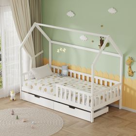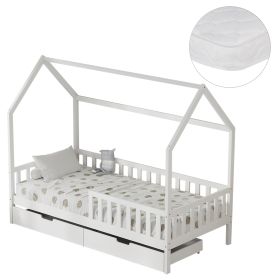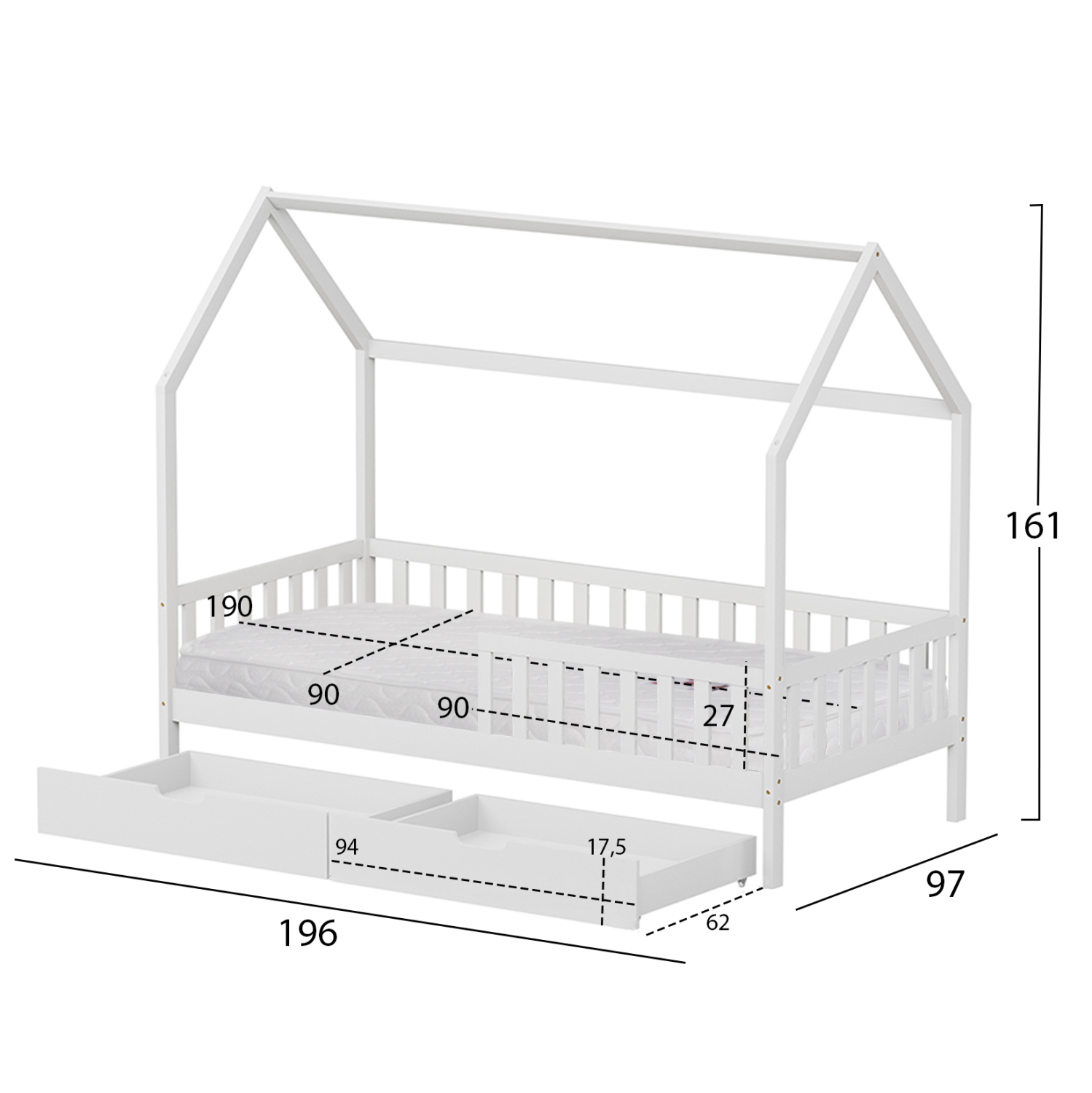 Το παιδικό κρεβάτι PHYLLIS τύπου Montessori σε διάσταση για στρώμα 90x190εκ, είναι κατασκευασμένο από ξύλο πεύκου σε ΛΕΥΚΟ χρώμα. Όλο το κρεβάτι έχει σχήμα σπιτιού με περιμετρικά κάγκελα και διαθέτει 2 συρτάρια στο κάτω μέρος ως αποθηκευτικό χώρο, ενώ το στρώμα τοποθετείται σε τάβλες από κόντρα-πλακέ ξυλεία.
