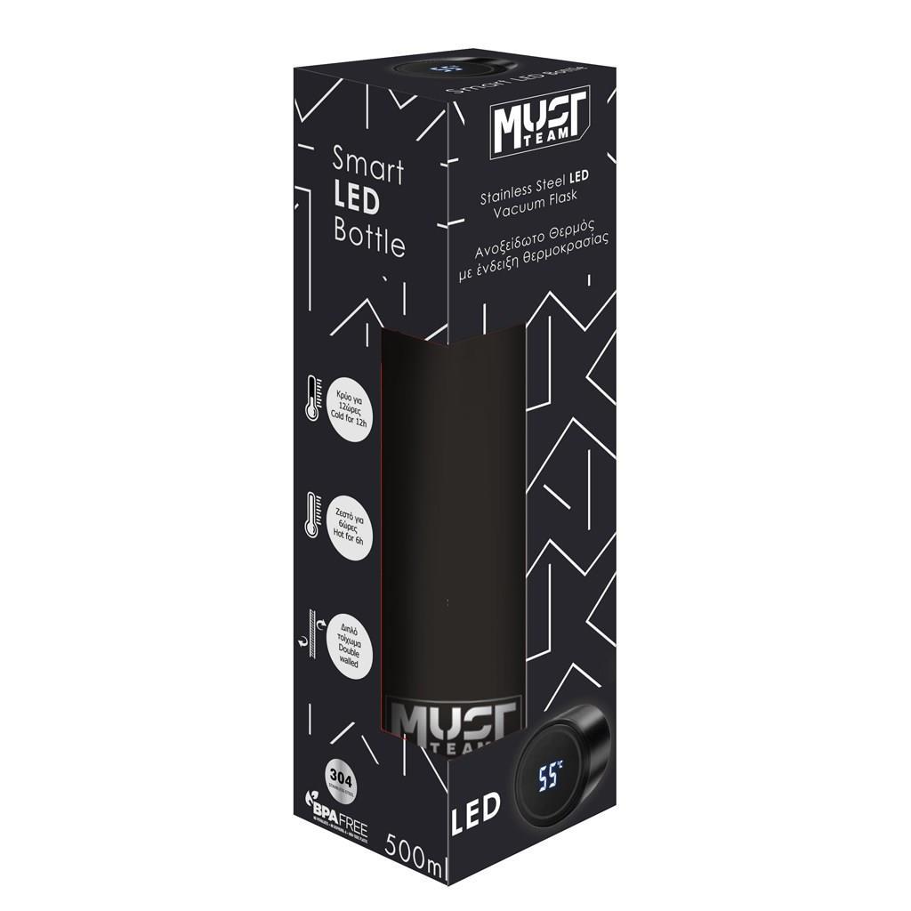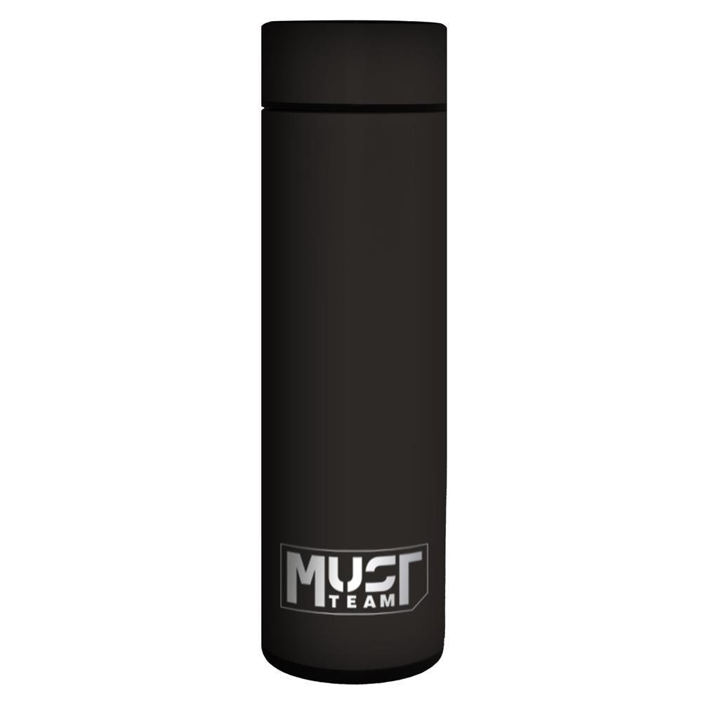 Θερμός Must 500ml Ανοξείδωτο με ένδειξη θερμοκρασίας LED και rubber υφή σε μαύρο χρώμα, ιδανικό για την απόλαυση αγαπημένων ζεστών και κρύων ροφημάτων με τον πιο ασφαλή και υγιεινό τρόπο σε κάθε αθλητική δραστηριότητα, το σχολείο, την εργασία και τις καθημερινές βόλτες!