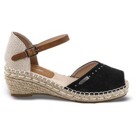 Γυναικεία εσπανδρίγια με τακούνι σε μαύρο χρώμα και καφέ λουράκι.