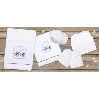 Λαδόπανα σετ για αγόρι σε λευκό χρώμα με κεντημένο μπλε καρουζέλ. Το σετ περιλαμβάνει λαδόπανο, πετσέτα, εσώρουχα και καπέλο. Παράδοση σε 8-10 εργάσιμες μέρες. Mouchtaris 17028