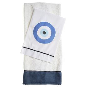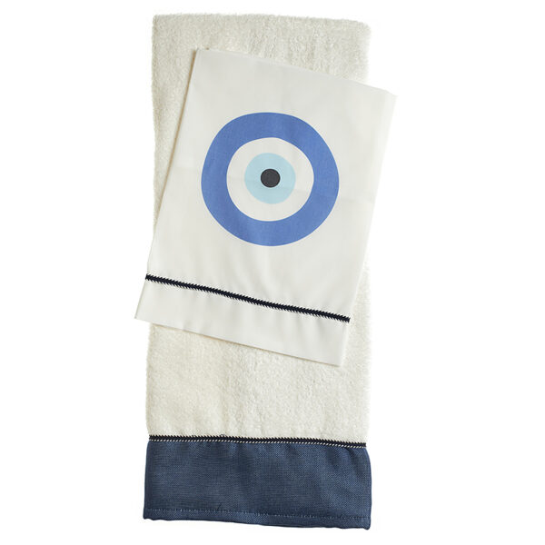 Λαδόπανα σετ για αγόρι σε λευκό ή εκρού χρώμα με εκτυπωμένο μάτι και μεγάλη μπλε φάσα. Παράδοση σε 5-10 εργάσιμες μέρες. Το σετ περιλαμβάνει λαδόπανο, πετσέτα και εσώρουχα.