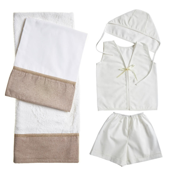 Το σετ περιλαμβάνει λαδόπανο , πετσέτα και εσώρουχα (φανελάκι, καπέλο, βρακάκι).