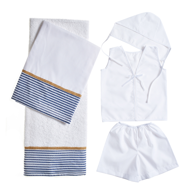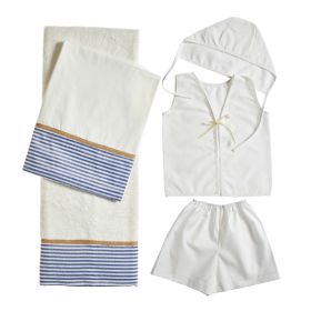 Λαδόπανα σετ για αγόρι σε εκρού ή λευκό χρώμα με μπλε ρίγες στη φάσα και καφέ σιρίτι. Παράδοση σε 5-10 εργάσιμες μέρες.