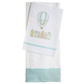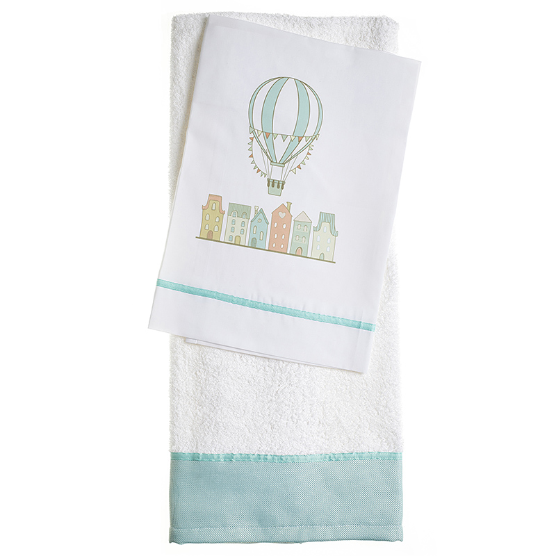 Λαδόπανα σετ για αγόρι σε λευκό χρώμα με φιγούρα αερόστατου και βεραμάν φάσα. Παράδοση σε 5-10 εργάσιμες μέρες.