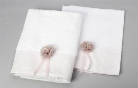 Άσπρο λαδόπανο με μεγάλη ροζ φάσα, λουλούδι με τούλι και κορδελάκια. Εταιρεία New Life 142718. Παράδοση σε 10-15 εργάσιμες μέρες.