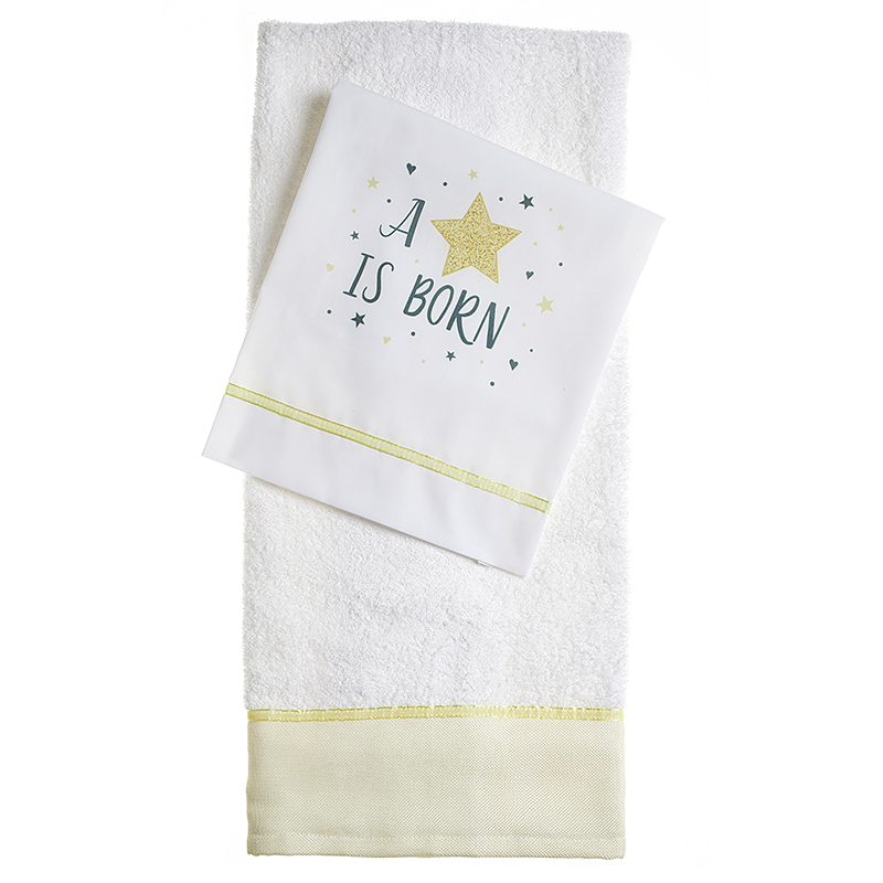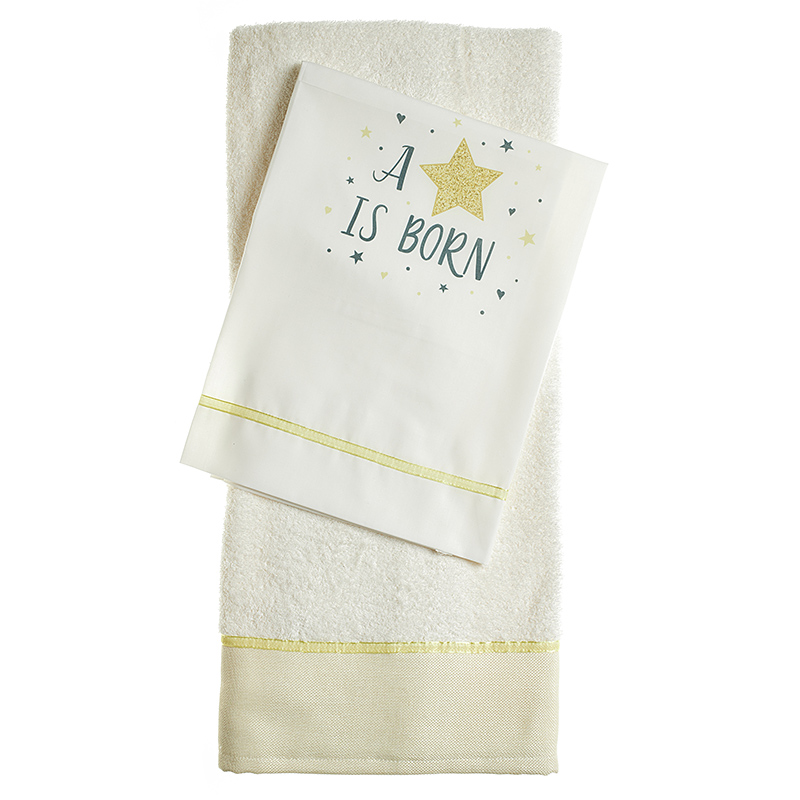 Λαδόπανα σετ για κορίτσι σε λευκό ή εκρού χρώμα με λογότυπο A star is born. Παράδοση σε 5-10 εργάσιμες μέρες. Το σετ περιλαμβάνει πετσέτα, λαδόπανο και εσώρουχα.