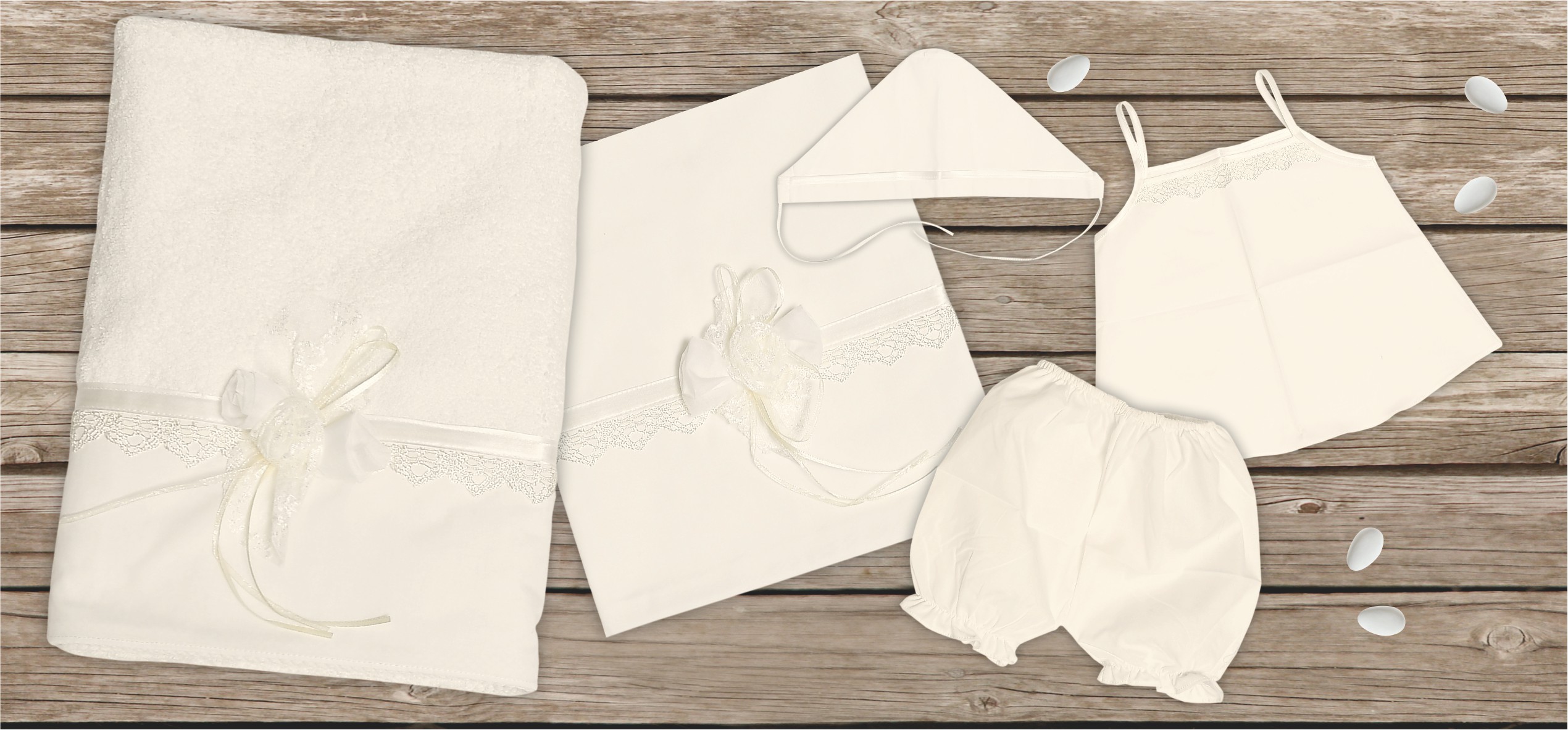 Λαδόπανα σετ για κορίτσι σε εκρού χρώμα με εκρού λουλούδι και δαντέλα σιρίτι. Το σετ περιλαμβάνει λαδόπανο, πετσέτα, εσώρουχα και καπέλο. Παράδοση σε 8-10 εργάσιμες μέρες. Mouchtaris 17052