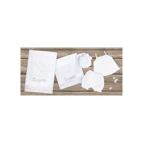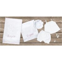 Λαδόπανα σετ για κορίτσι σε λευκό χρώμα με κεντημένο το όνομα της επιλογής σας. Το σετ περιλαμβάνει λαδόπανο, πετσέτα, εσώρουχα και καπέλο. Παράδοση σε 8-10 εργάσιμες μέρες. Mouchtaris 17035.