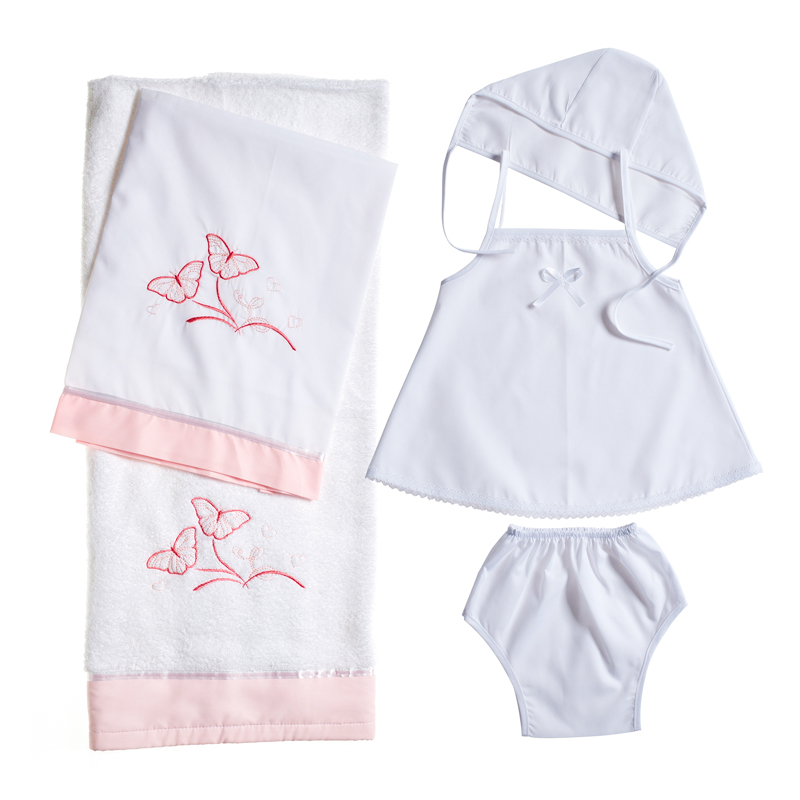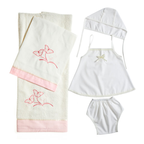 Λαδόπανα σετ για κορίτσι σε λευκό ή εκρού χρώμα με ροζ κεντημένες πεταλούδες. Παράδοση σε 5-10 εργάσιμες μέρες. Το σετ περιλαμβάνει πετσέτα, λαδόπανο και εσώρουχα.