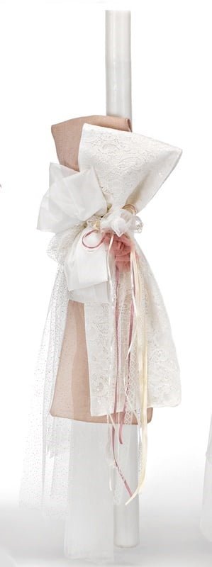 Λαμπάδα βάπτισης για κορίτσι με λευκό δαντελένιο και καφέ φιόγκο. Παράδοση σε 15-20 εργάσιμες μέρες. BULA ΛΑΜ924.