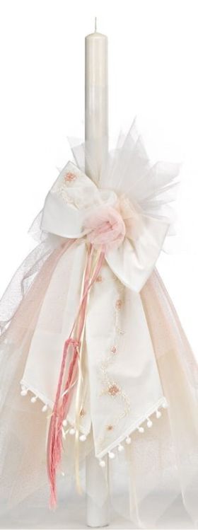 Λαμπάδα βάπτισης για κορίτσι με λευκό κεντημένο φιόγκο και ροζ τούλι. Παράδοση σε 15-20 εργάσιμες μέρες. BULA ΛΑΜ918.